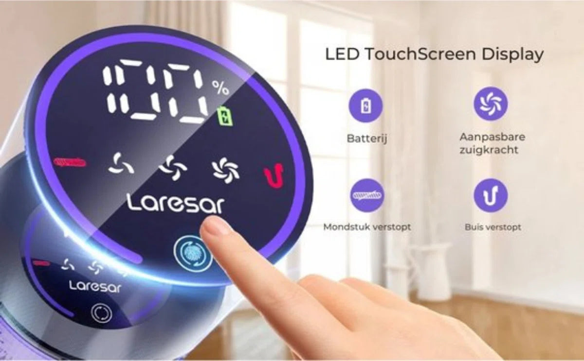 Intelligent Touchscreen: Het grote LED-scherm toont het batterijniveau in realtime en maakt het aanpassen van de zuigkracht eenvoudig door aan de zuigstang te trekken. Met een ingebouwde blokkadedetectiefunctie wordt u direct gewaarschuwd voor eventuele blokkades.