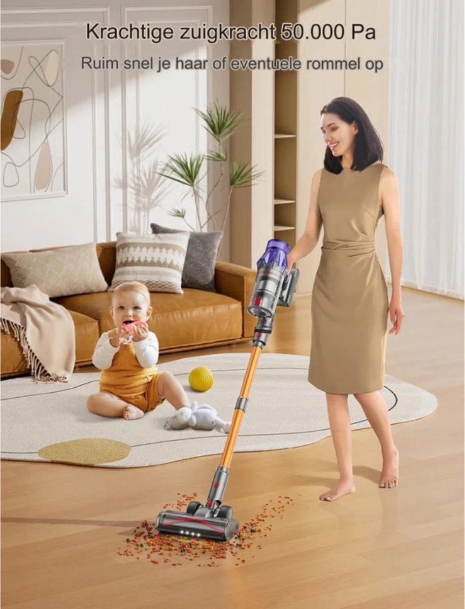 Krachtige Reiniging: Uitgerust met een krachtige 500W borstelloze motor en een zuigkracht tot 5000kPa, biedt deze draadloze stofzuiger een stille en effectieve reinigingservaring. Pas eenvoudig de zuigkracht aan tussen 15-50kPa voor verschillende schoonmaaktaken.