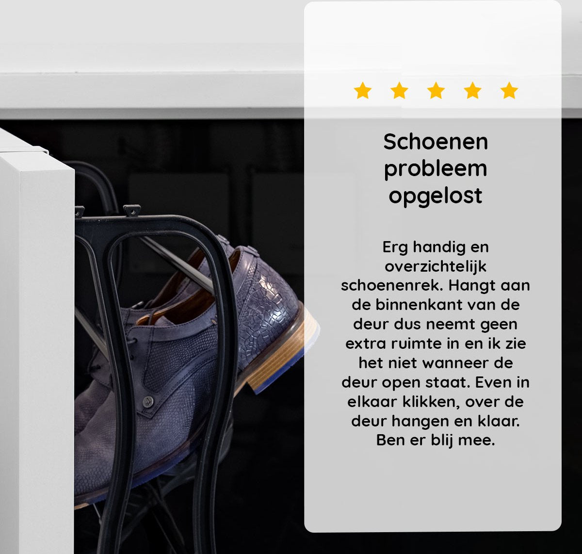 Ons ruimtebesparende schoenenrek is de perfecte oplossing voor mensen met beperkte opslagruimte in hun huis. Het unieke ontwerp van het rek zorgt ervoor dat je meer paar schoenen op één plek kunt opbergen, wat betekent dat je minder ruimte nodig hebt om al je schoenen op te bergen.