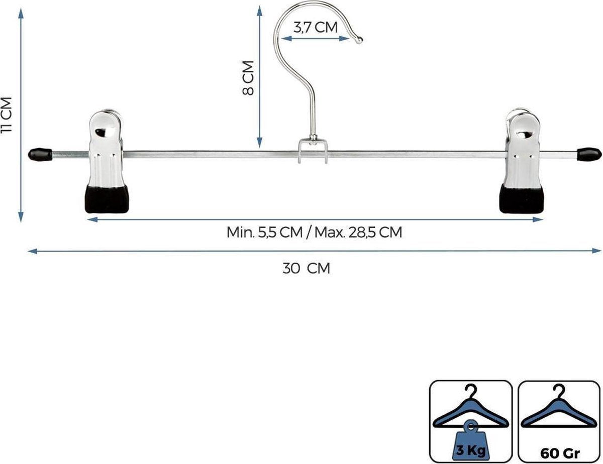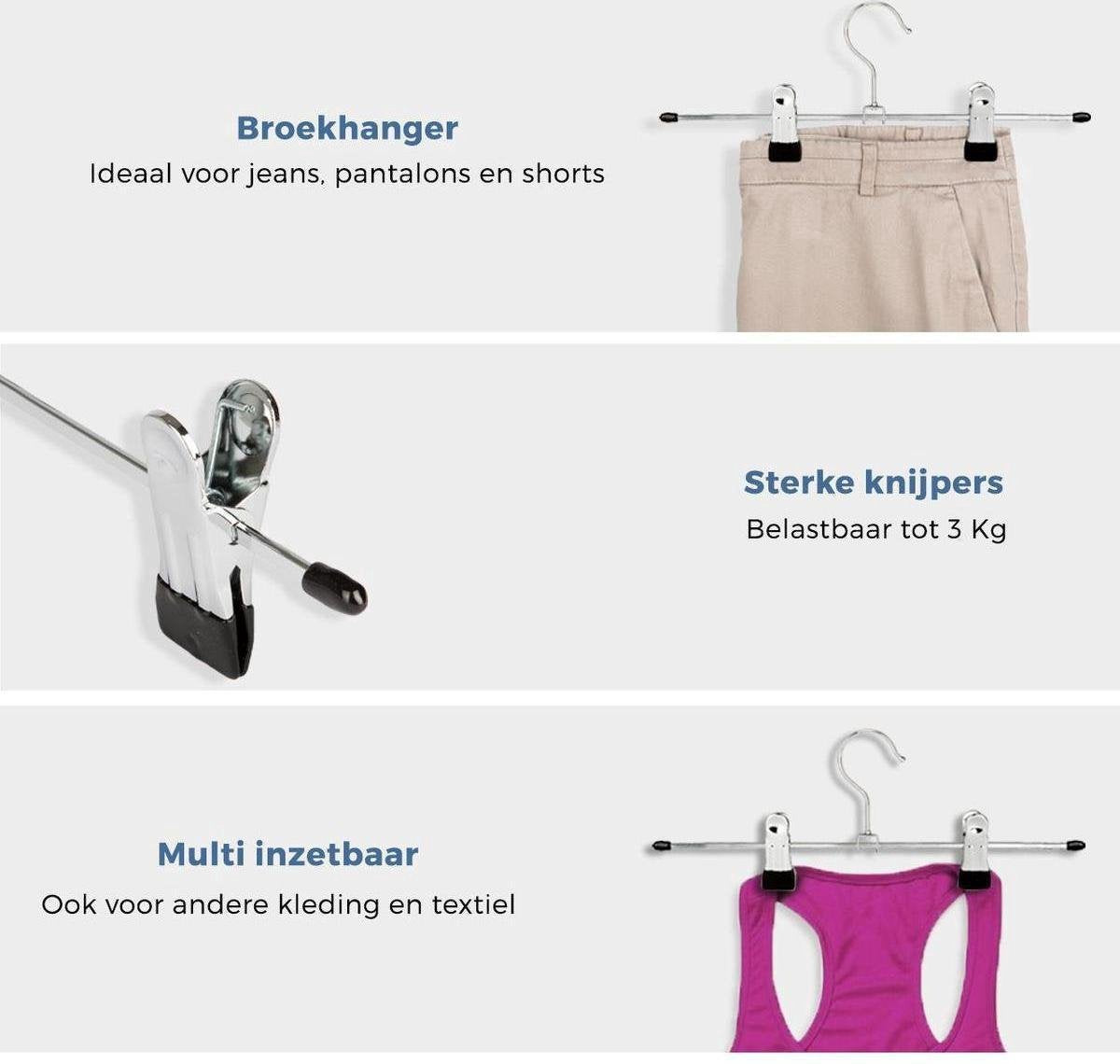 De verstelbare haken maakt deze broekhangers ook geschikt voor kleinere kledingstukken en accessoires. Door de sterke haken met antisliplaag blijven alle kledingstukken tot 5 kg probleemloos hangen. Hierdoor voorkom je plooien en kreuken in je kleding en bespaar je extra moeite met strijken of stomen. De 20 broekhangers met knijpers is een goed begin om je kledingkast te ordenen. Door gebruik te maken van de broekhangers maak je de kast overzichtelijk en bespaar je veel ruimte.