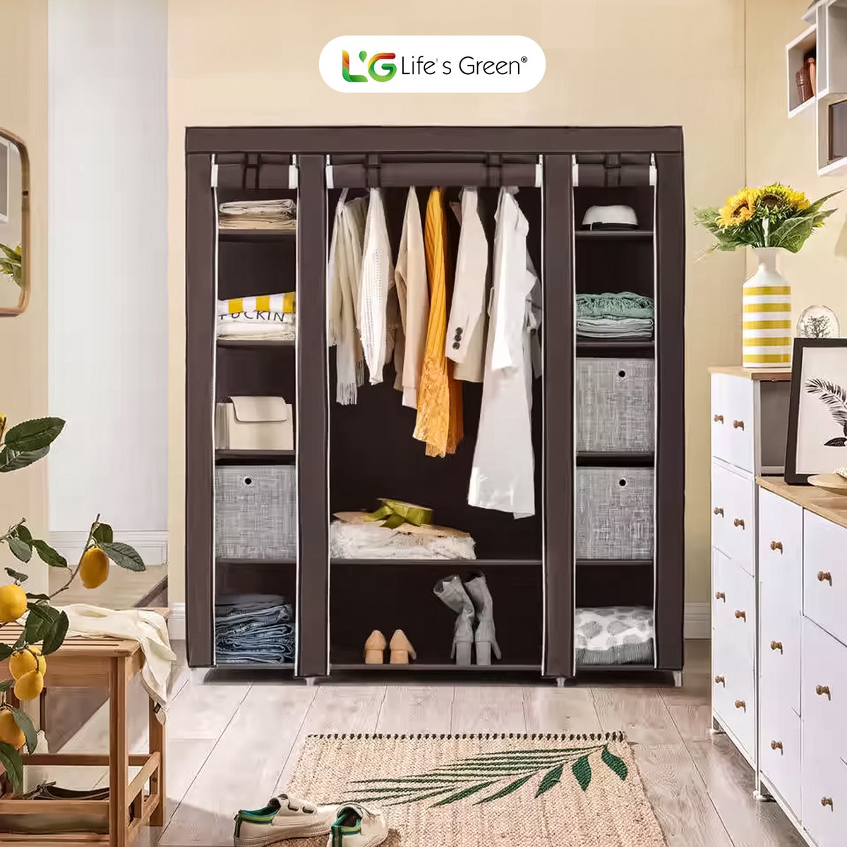 Gemak en ruimte gaan hand in hand met de Life's Green® kledingkast. Het biedt niet alleen genoeg ruimte voor al jouw kledingstukken en schoenen, maar is ook zeer gebruiksvriendelijk. Het in elkaar zetten van de kast is een fluitje van een cent, je hebt geen gereedschap nodig. Ideaal voor wie vaak verhuist of graag de inrichting verandert. Met de handige ophangstang hang je al je kleding gemakkelijk op. En met vakken berg je eenvoudig alle overige kleding of je schoenen op!
