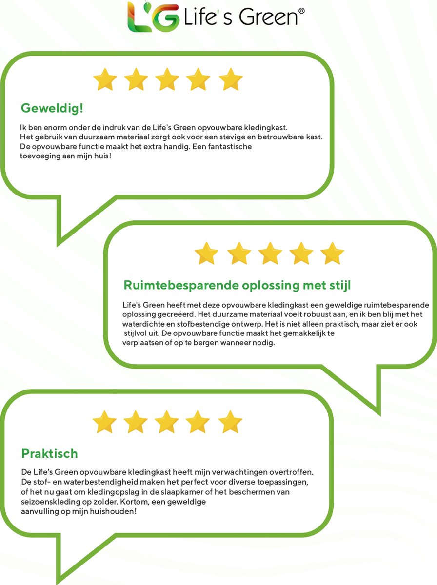 Ben je op zoek naar een snelle, stijlvolle en praktische oplossing voor jouw kleding en schoenen? Ontdek de Life's Green® kledingkast. Deze opbergkast is niet alleen een blikvanger in elke ruimte, maar biedt ook genoeg ruimte voor al jouw kleding en accessoires. Met zijn unieke design is de garderobekast niet alleen een prachtige toevoeging aan jouw interieur, maar ook een duurzame keuze. Daarnaast is de stoffen kledingkast ook geschikt als campingkast!