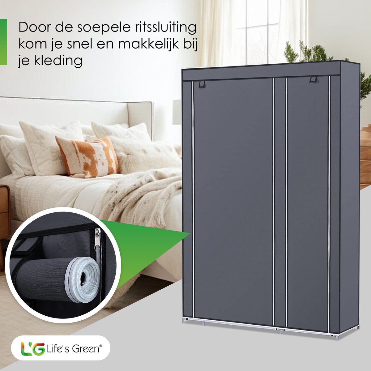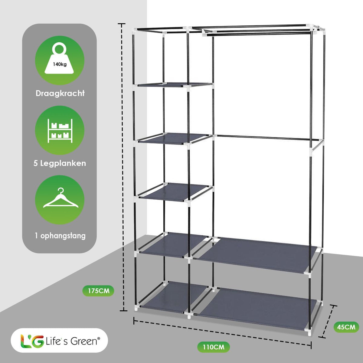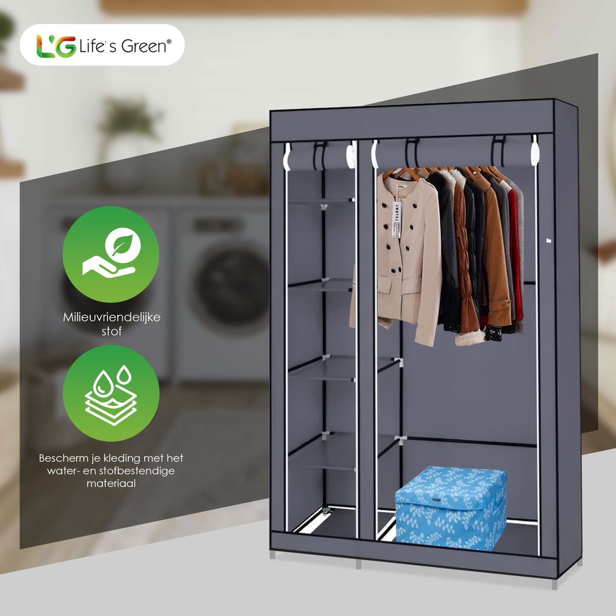 Gemak en ruimte gaan hand in hand met de Life's Green® kledingkast. Het biedt niet alleen genoeg ruimte voor al jouw kledingstukken en schoenen, maar is ook zeer gebruiksvriendelijk. Het in elkaar zetten van de kast is een fluitje van een cent, je hebt geen gereedschap nodig. Ideaal voor wie vaak verhuist of graag de inrichting verandert. Met de handige ophangstang hang je al je kleding gemakkelijk op. En met vakken berg je eenvoudig alle overige kleding of je schoenen op!