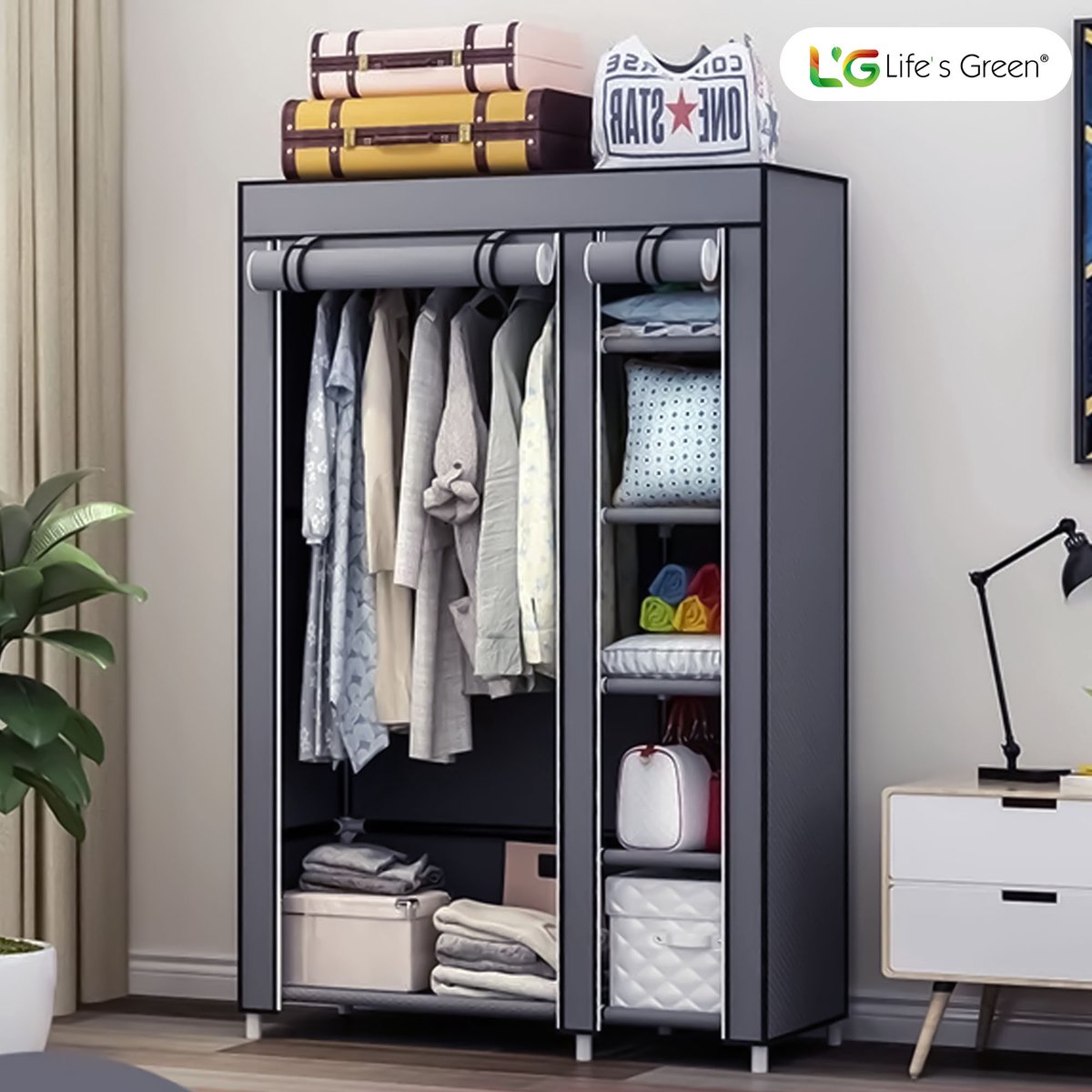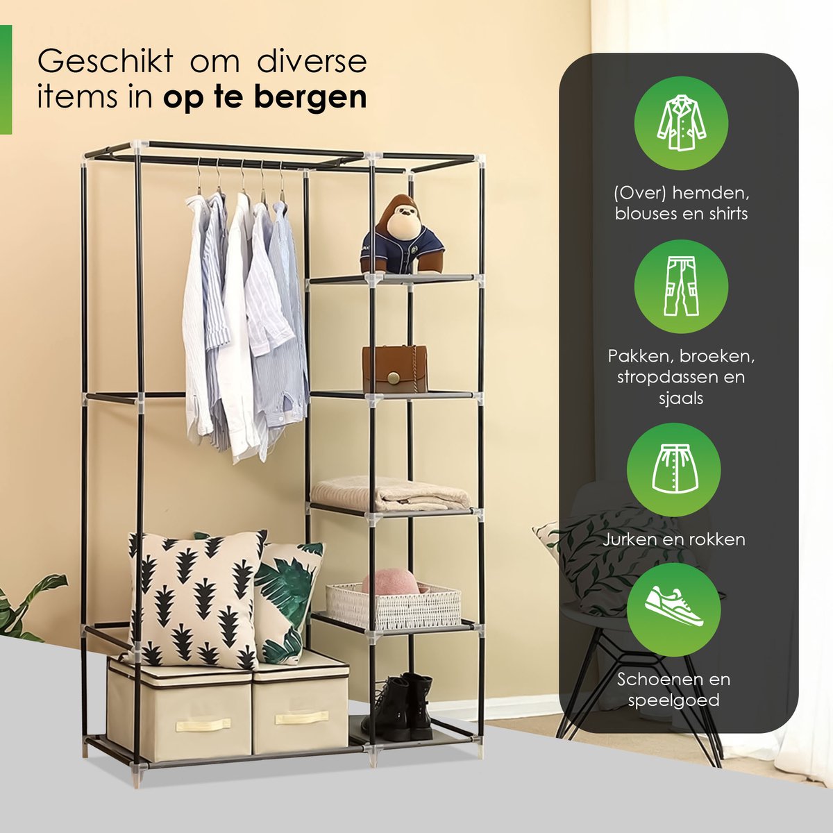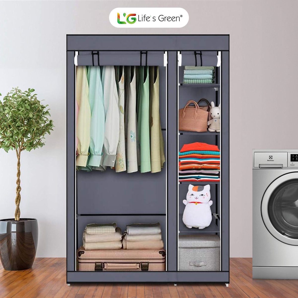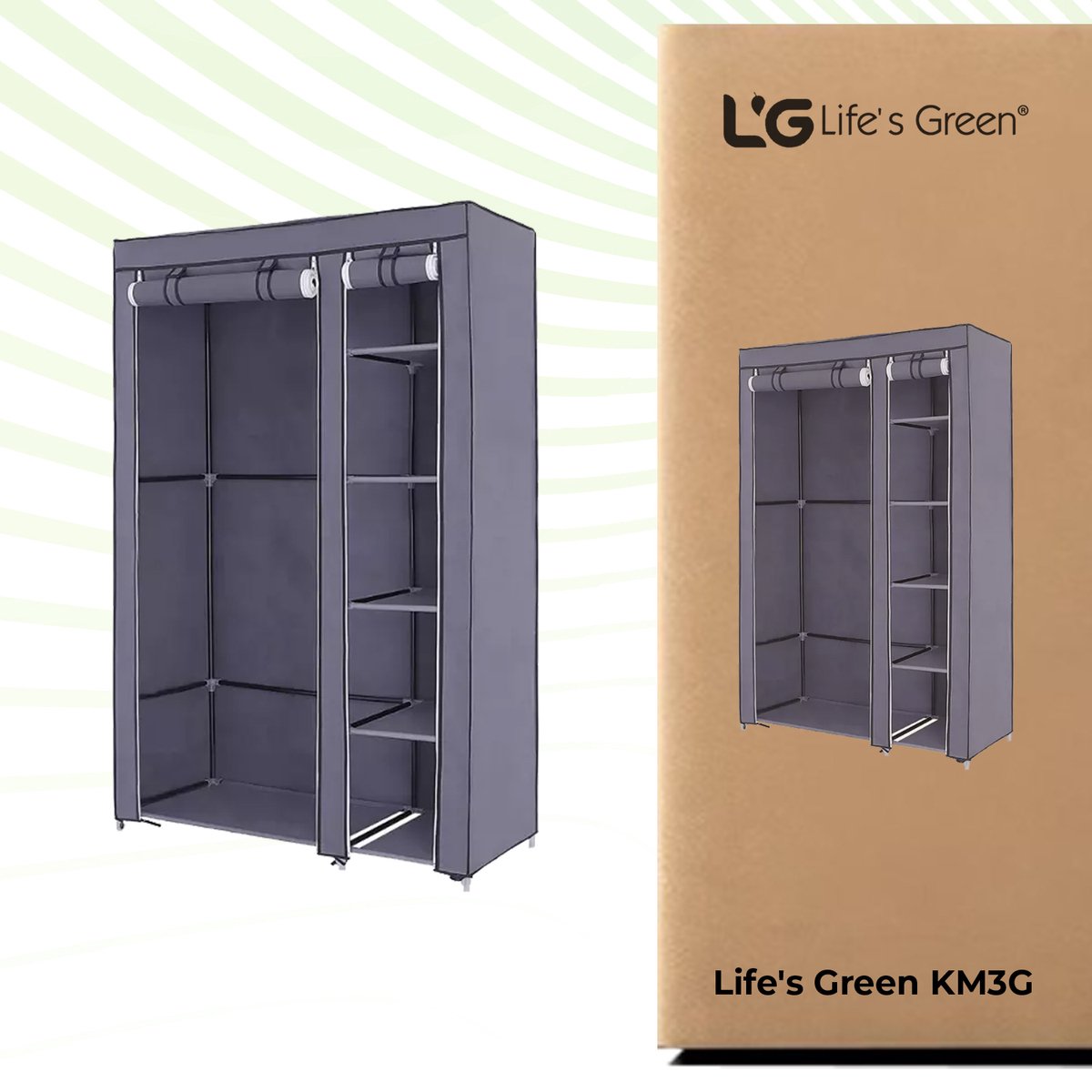 Gemak en ruimte gaan hand in hand met de Life's Green® kledingkast. Het biedt niet alleen genoeg ruimte voor al jouw kledingstukken en schoenen, maar is ook zeer gebruiksvriendelijk. Het in elkaar zetten van de kast is een fluitje van een cent, je hebt geen gereedschap nodig. Ideaal voor wie vaak verhuist of graag de inrichting verandert. Met de handige ophangstang hang je al je kleding gemakkelijk op. En met vakken berg je eenvoudig alle overige kleding of je schoenen op!