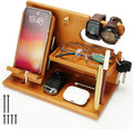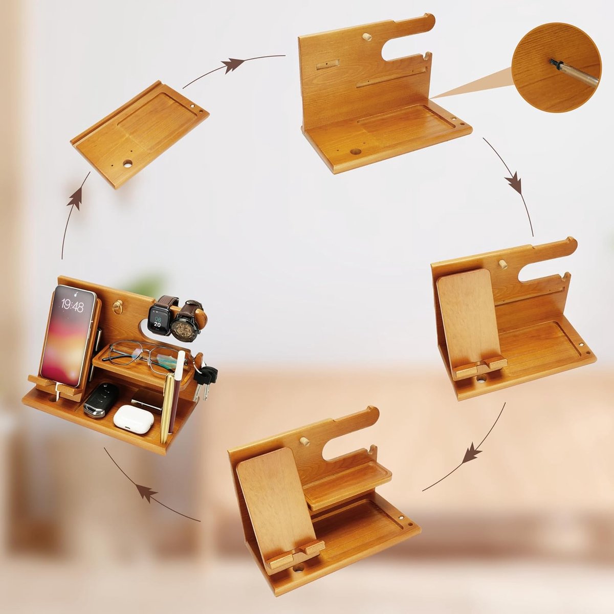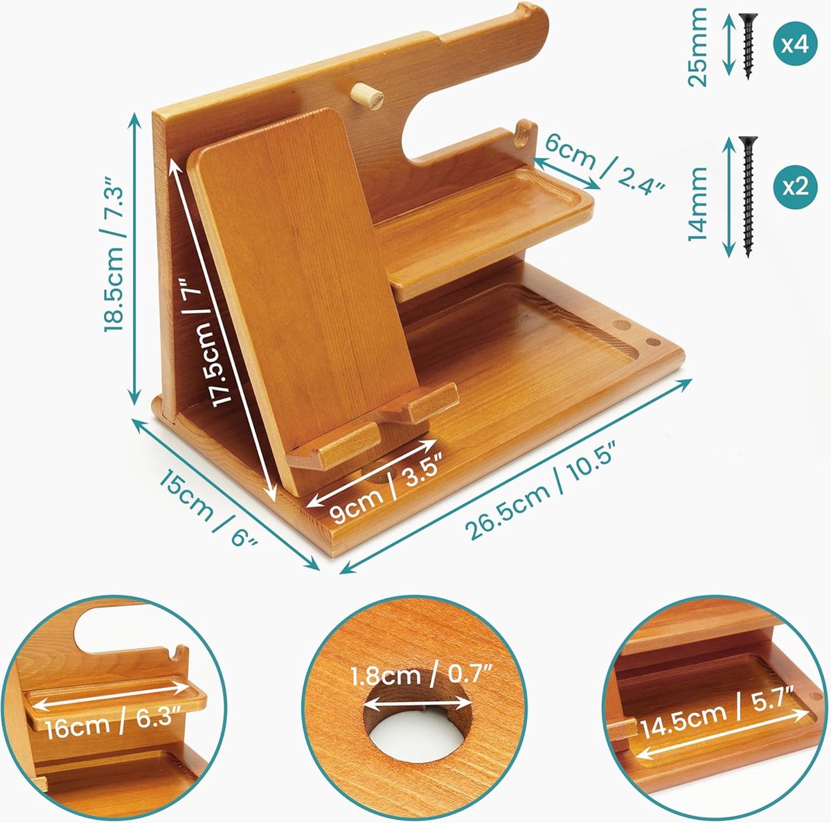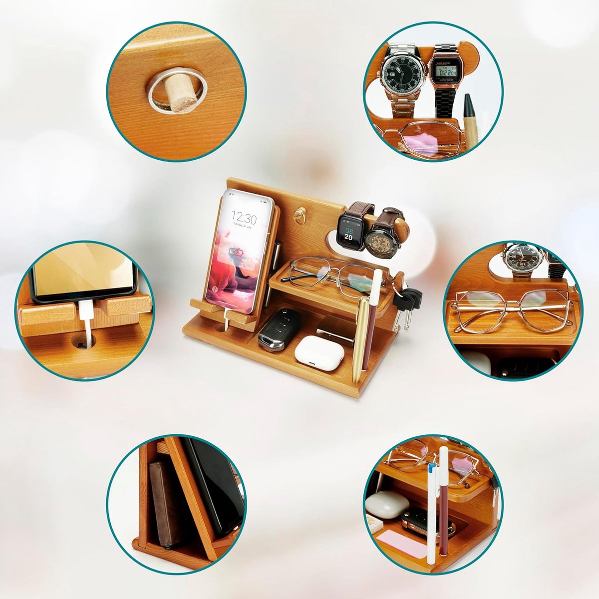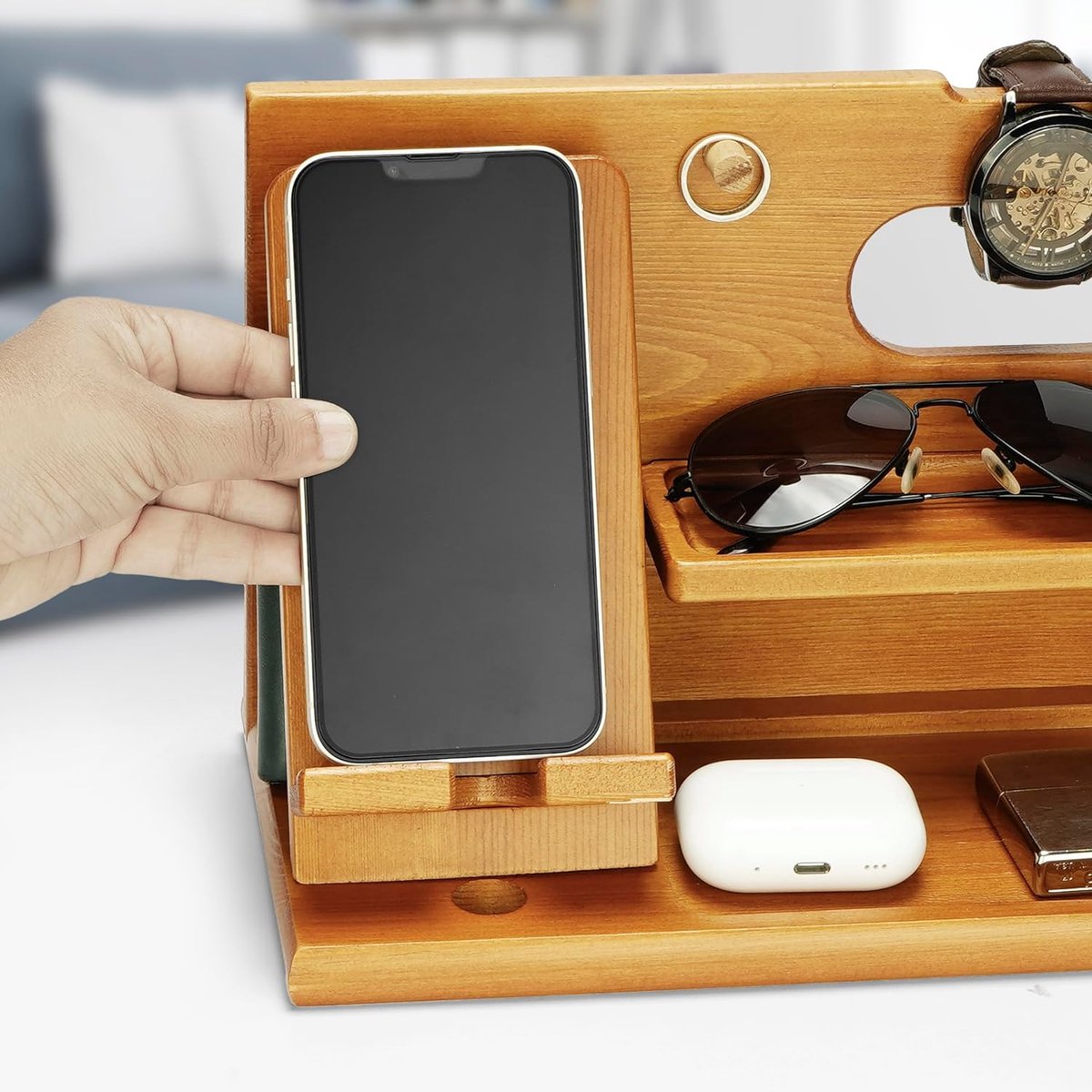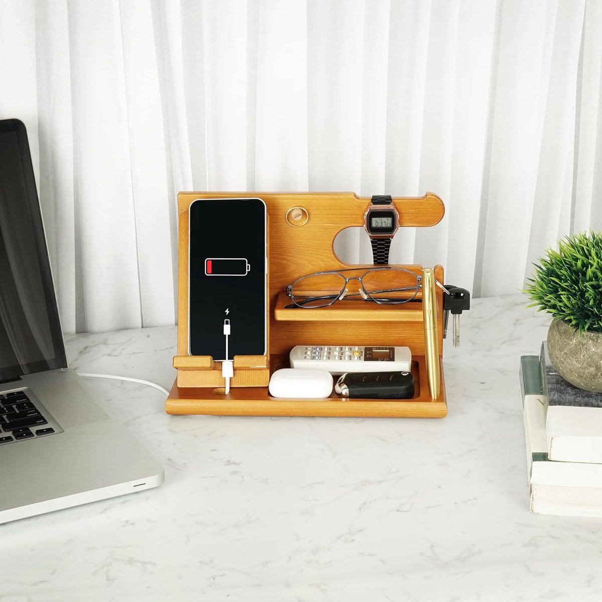 Lichtbruin houten dockingstation - nachtkastje-organizer - voor het opbergen van telefoon, portemonnees, horloges, gadgets en sleutels - cadeaus voor mannen - accessoires voor man/vader