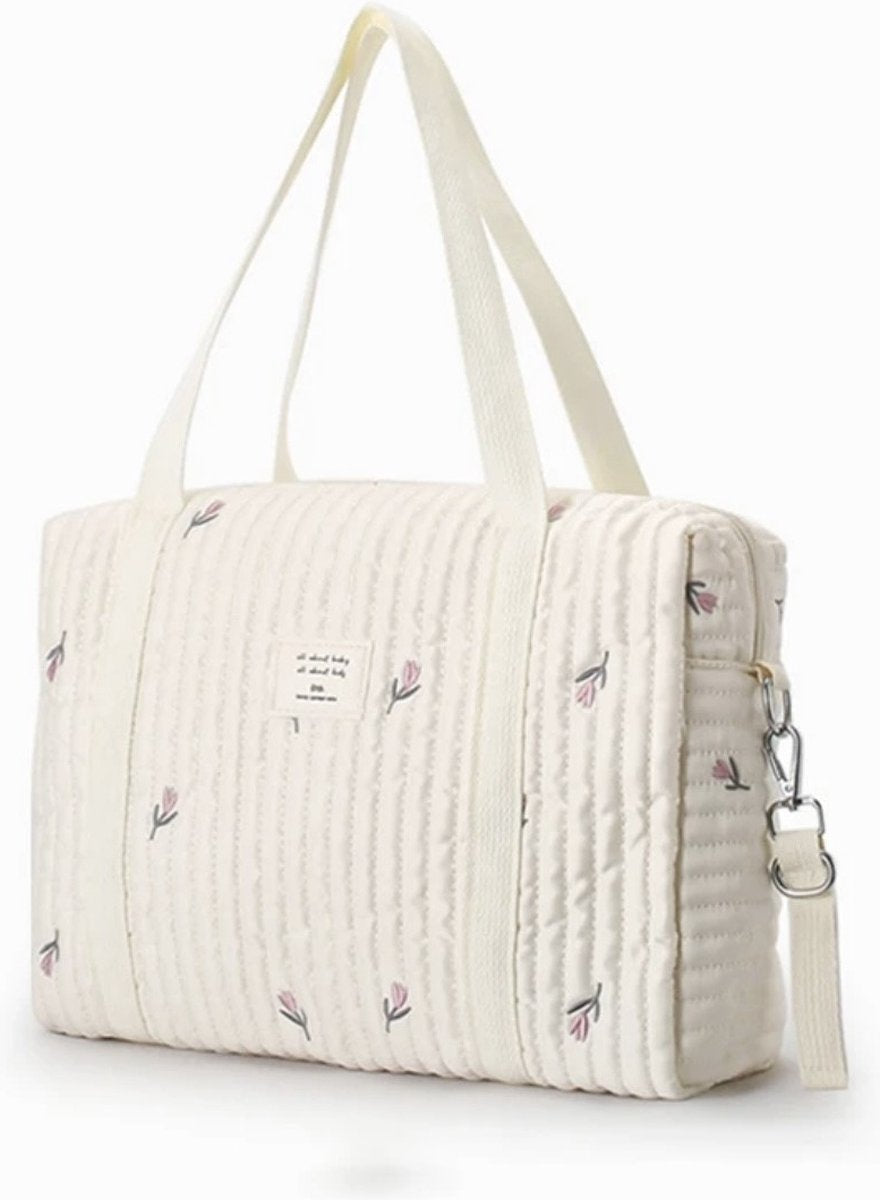 Luiertas - Mombag - Schoudertas - Verzorgingstas - Kraamcadeau - Groot - Bloemmotief - Tulp - Beige