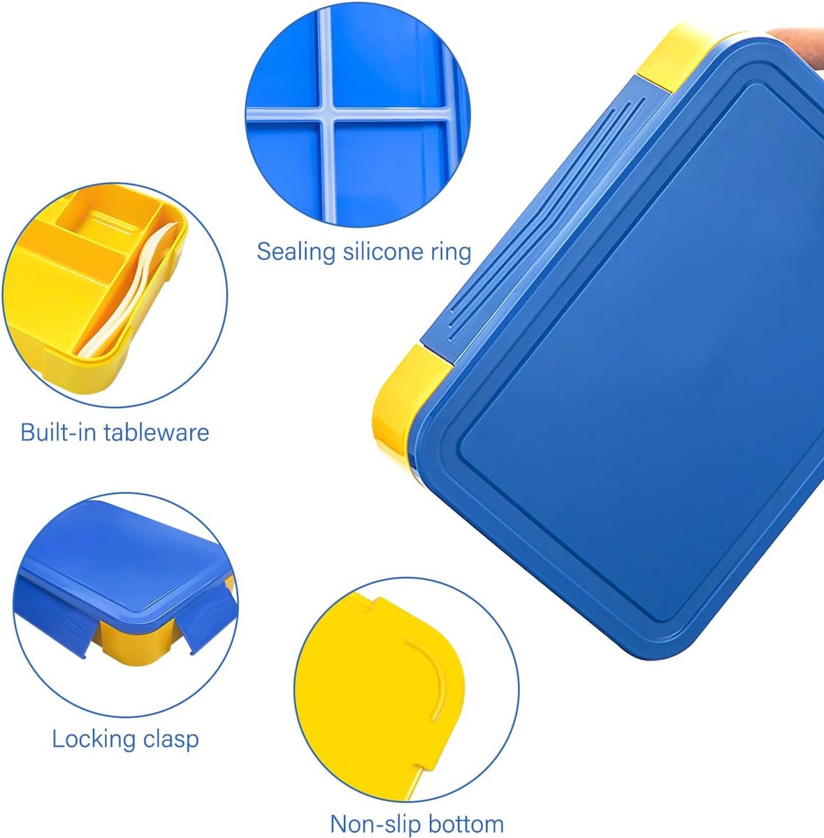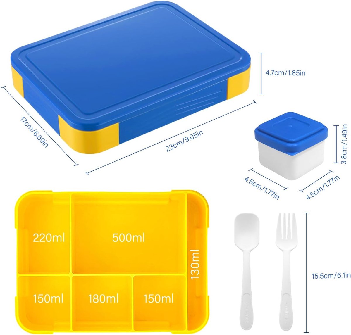 Lunchbox 1300 ml, lekvrij, broodtrommel voor kinderen met 5 vakken en bestekset, BPA-vrij, broodtrommel voor kinderen en volwassenen, voor magnetron, vaatwasser (blauw-geel)