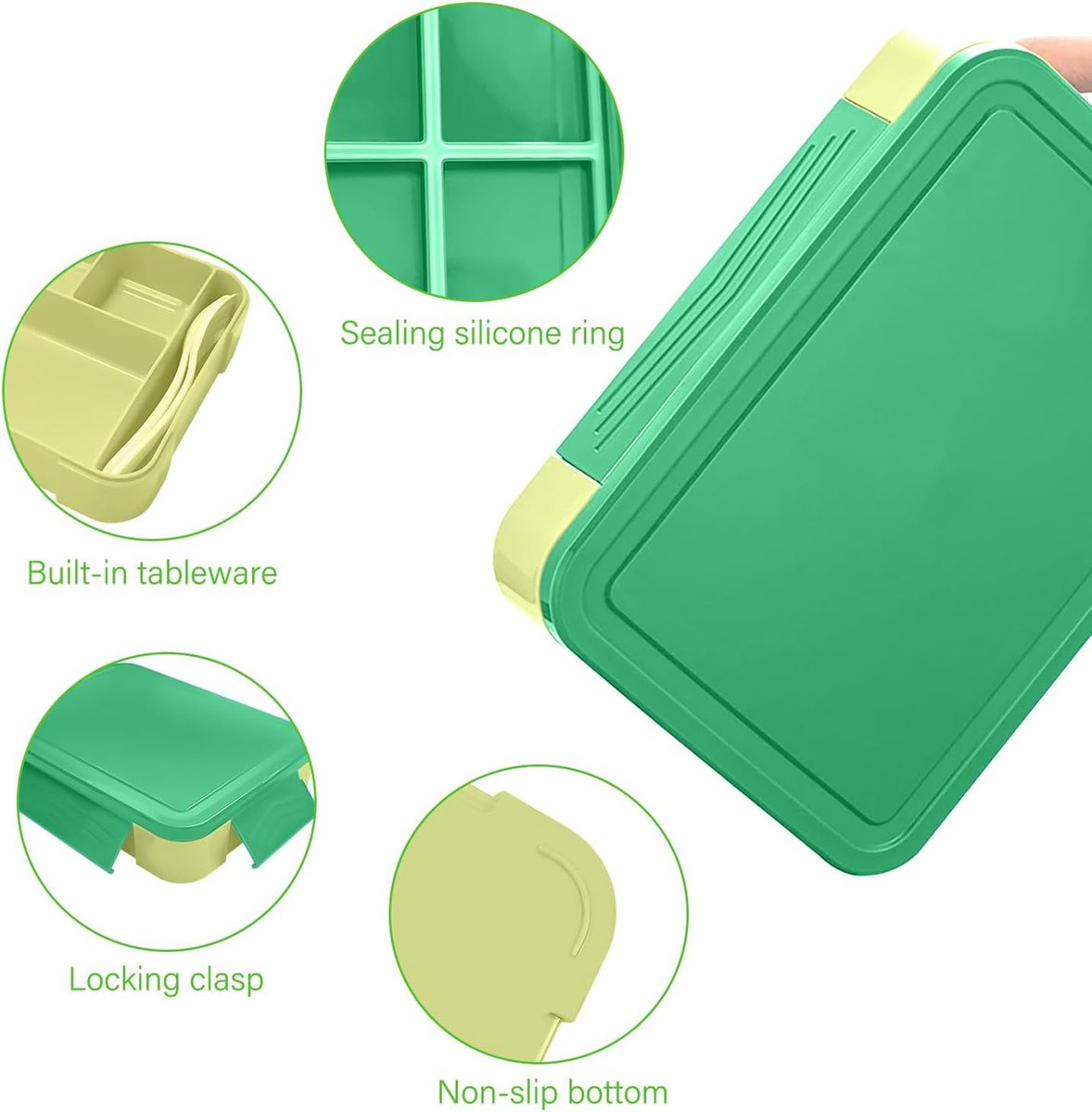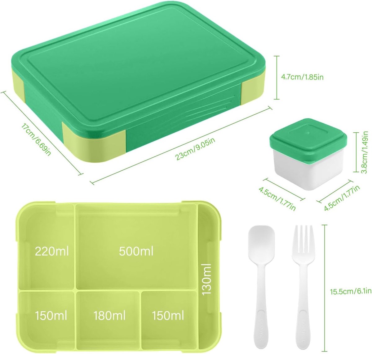 Lunchbox 1300 ml, lekvrij, broodtrommel voor kinderen met 5 vakken en bestekset, BPA-vrij, broodtrommel voor kinderen en volwassenen, voor magnetron, vaatwasser (groen)
