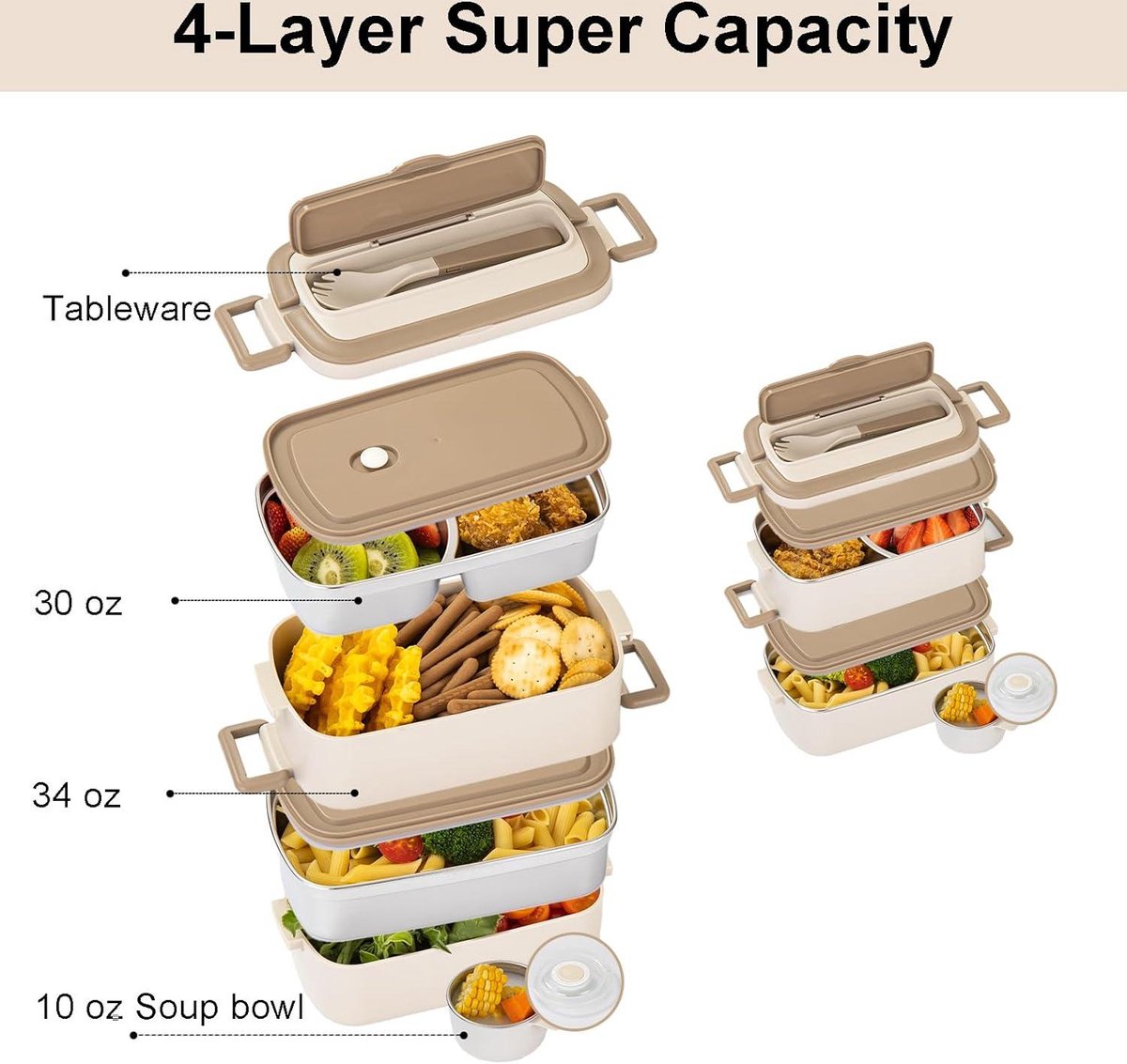 Deze lunchbox met 2 niveaus is perfect voor iedereen die onderweg geniet van een zelfbereide maaltijd. Gemaakt van hoogwaardig roestvrij staal en plastic, is deze lunchbox duurzaam, roestbestendig en veilig voor voedsel, aangezien hij vrij is van schadelijke chemicaliën zoals BPA. De lekvrije deksels zorgen ervoor dat er geen morsen optreedt, waardoor uw maaltijden veilig en rommelvrij blijven tijdens het transport. De lunchbox heeft een 2-tier 3-compartimenteel ontwerp, waardoor u verschillende soorten voedsel kunt scheiden en meenemen. De bovenste laag heeft 2 compartimenten, inclusief een soepkom met lekvrije deksel, terwijl de onderste laag ideaal is voor vast voedsel. Bij de lunchbox wordt een roestvrijstalen soepkom en een 2-in-1 lepel en vork set inbegrepen, waardoor het een complete maaltijdset is voor onderweg. De speciaal ontworpen geïsoleerde lunchtas houdt uw eten urenlang op de gewenste temperatuur. Dankzij het compacte handvatontwerp, de geïsoleerde tas en veilige grendels is deze lunchbox draagbaar en handig voor op het werk, op school, tijdens picknicks of op reis. Het is ook milieuvriendelijk, omdat de roestvrijstalen constructie herbruikbare verpakkingen bevordert en gemakkelijk schoon te maken is. De lunchbox heeft een grote capaciteit: 1 laag van 900 ml, 1 laag van 1000 ml en een 300 ml soepkom, waardoor het handig is voor portiecontrole en maaltijdplanning. Productspecificaties:- Materiaal: roestvrij staal, plastic- Afmetingen: 18 x 13,5 x 27,5 cm- Gewicht: 900 gram- Kleur: zilver- Capaciteit: 900 ml + 1000 ml + 300 ml- Inclusief: roestvrijstalen soepkom, 2-in-1 lepel en vork- Vaatwasserbestendig: ja