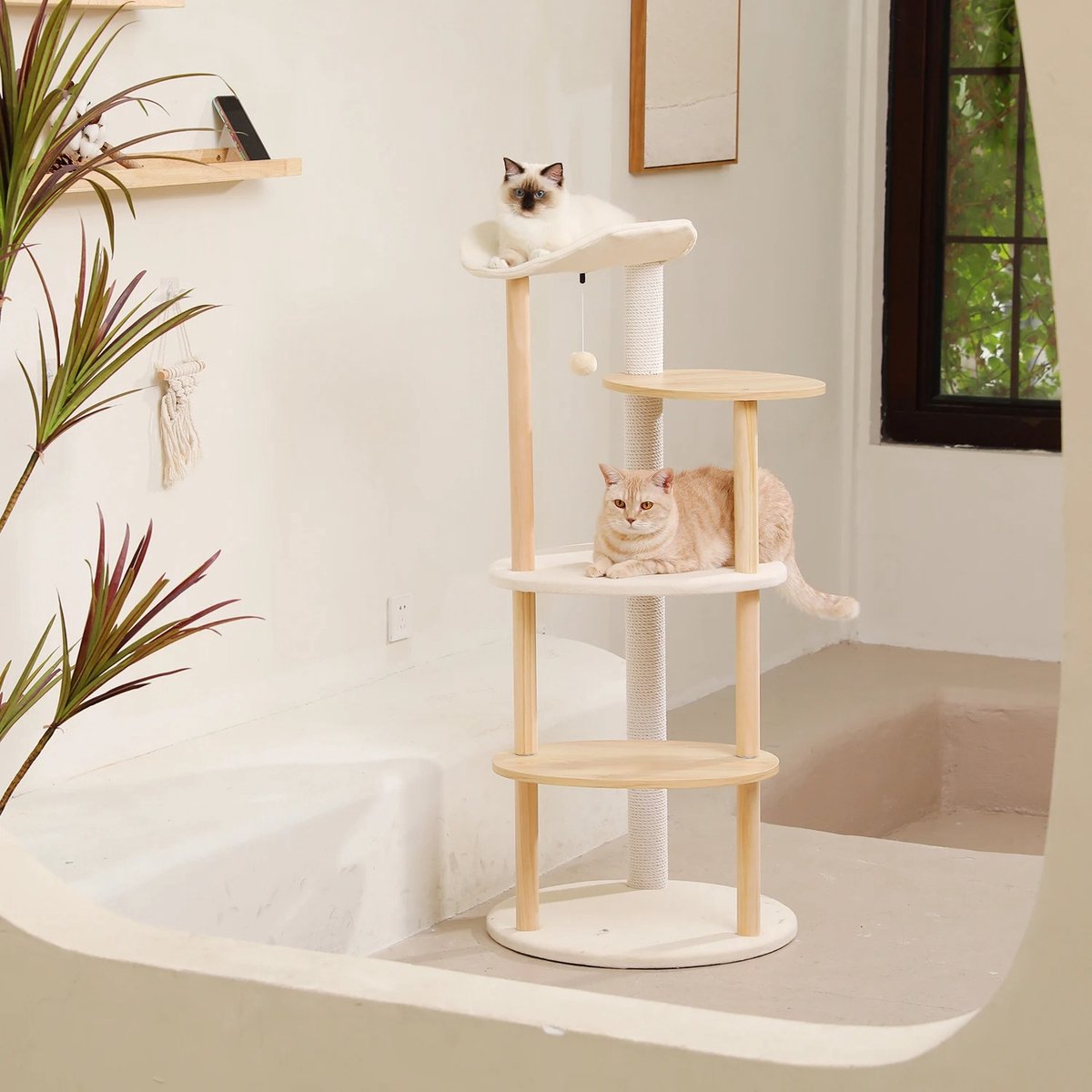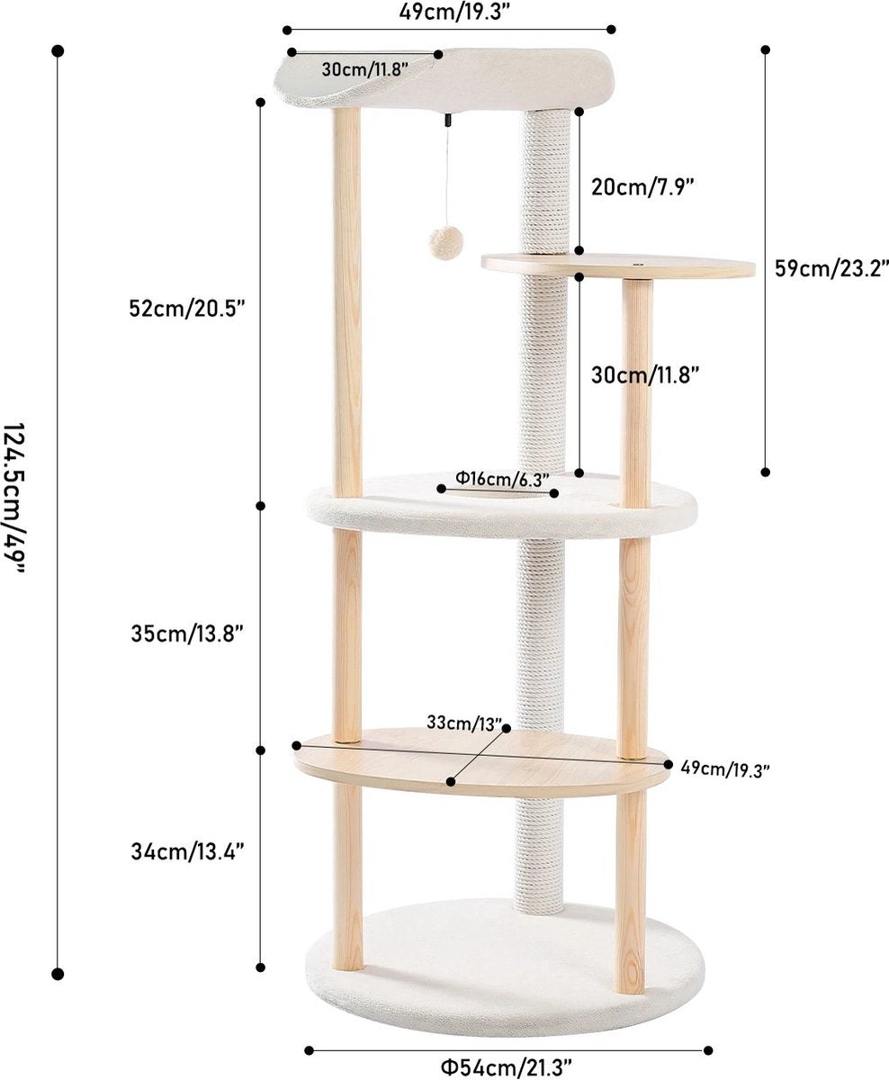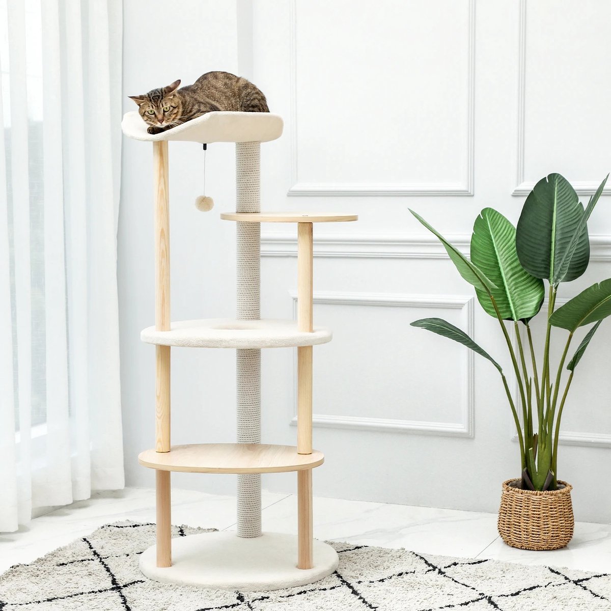 Luxe houten Krabpaal 124,5 cm hoog - middel en grote katten klimboom - Met natuurlijke sisal touw - Met 4 ligvlakken en holten - Comfortabel en stabiel - Hout
