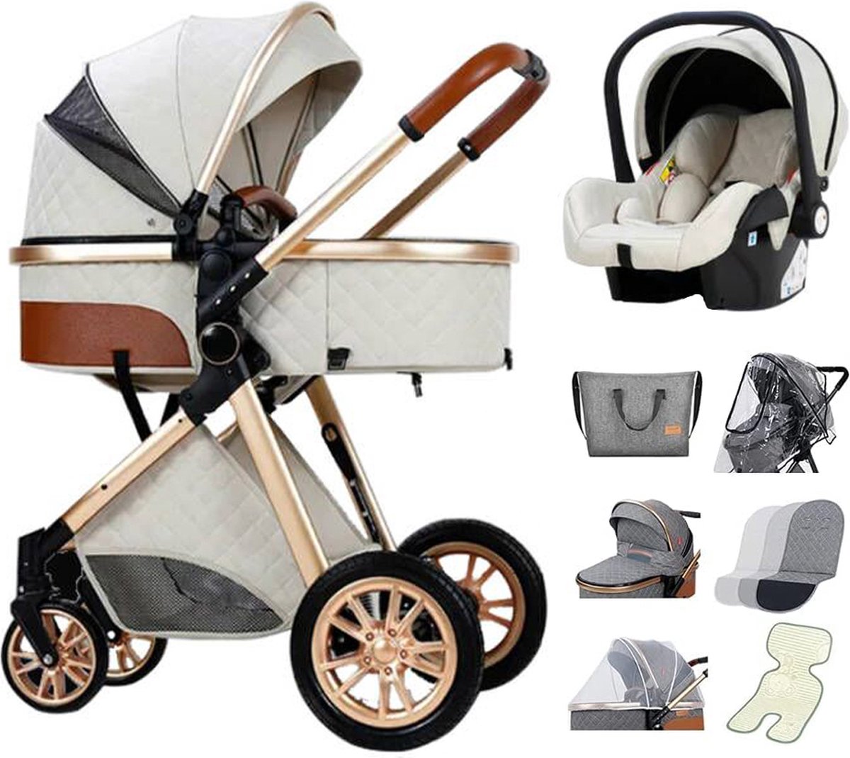Luxe Multifunctionele 3-in-1 Combi Kinderwagen – Kwalitatieve Buggy – Opklapbare Wandelwagen – Crème – Incl. Autostoel