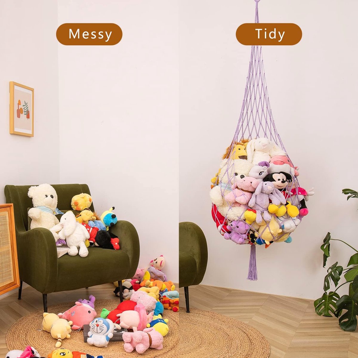 • Laat je schattige knuffels zien Waarom zou je deze schattige knuffels verstoppen als je ze ook kunt laten zien? De boho hoekhangmat is een leuk, mooi en functioneel idee als opbergoplossing voor drukke kinderdagverblijven. Het net heeft een elegant patroon met veel details en fleurt een hoekje van elke babykamer voor jongens of meisjes op.