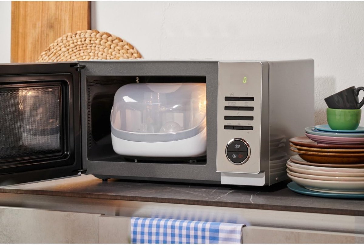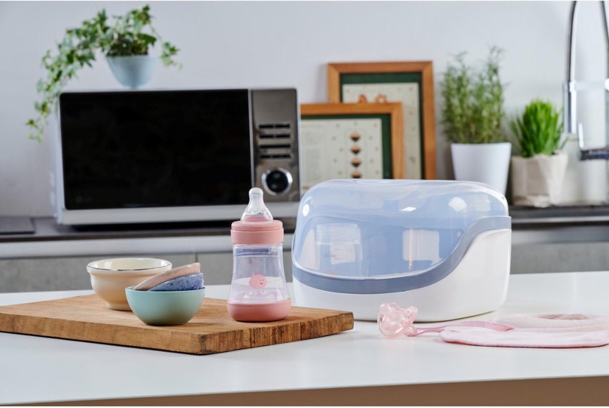 De Magnetron Sterilisator maakt gebruik van stoom om snel en efficiënt 99,9% van de gebruikelijke huishoudelijke kiemen te elimineren. Dit zorgt ervoor dat babyflesjes, fopspenen en andere accessoires in enkele minuten hygiënisch schoon zijn, wat het een praktische keuze maakt voor drukke ouders.