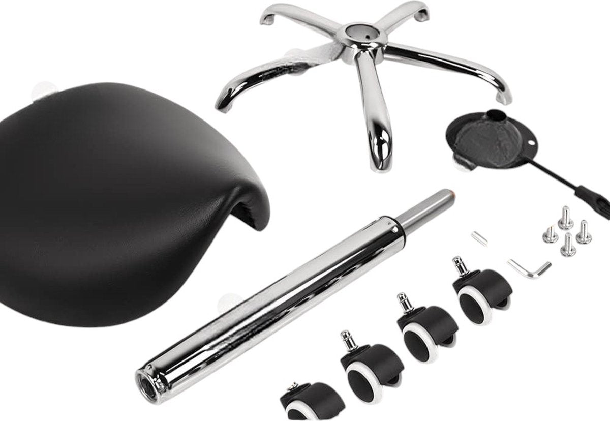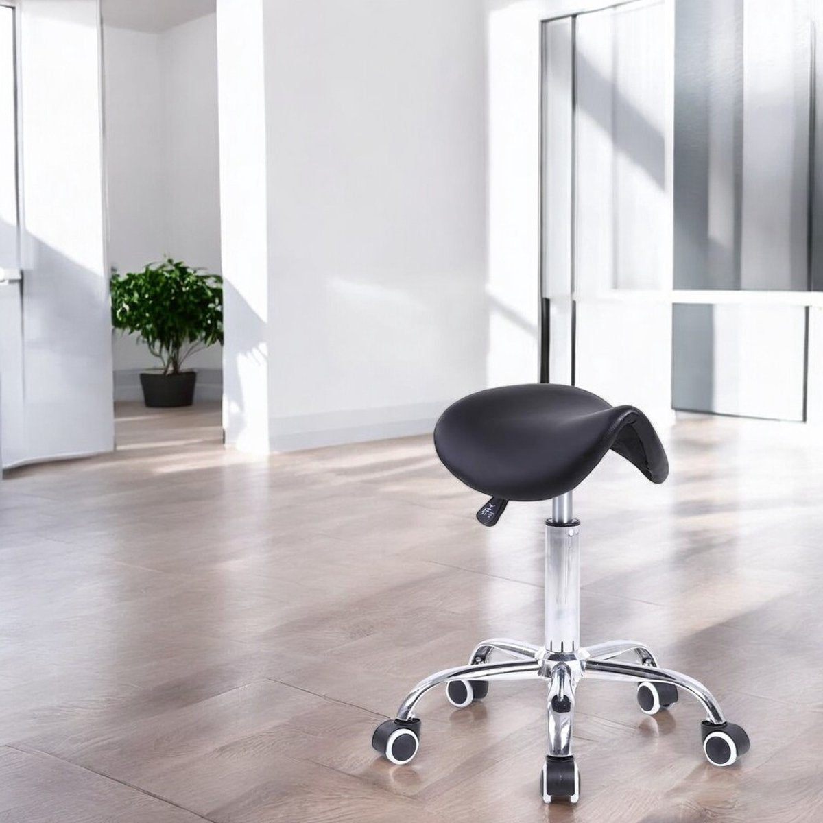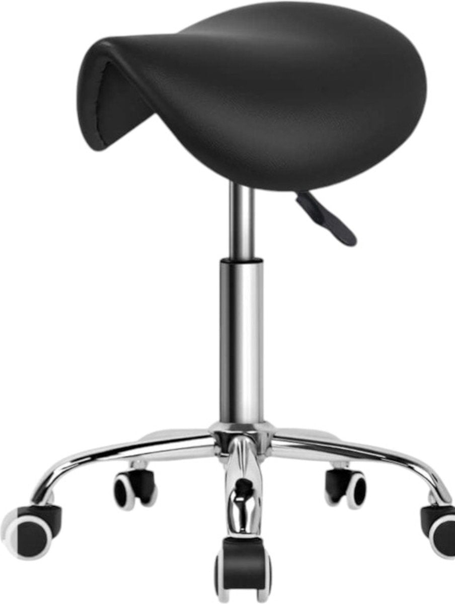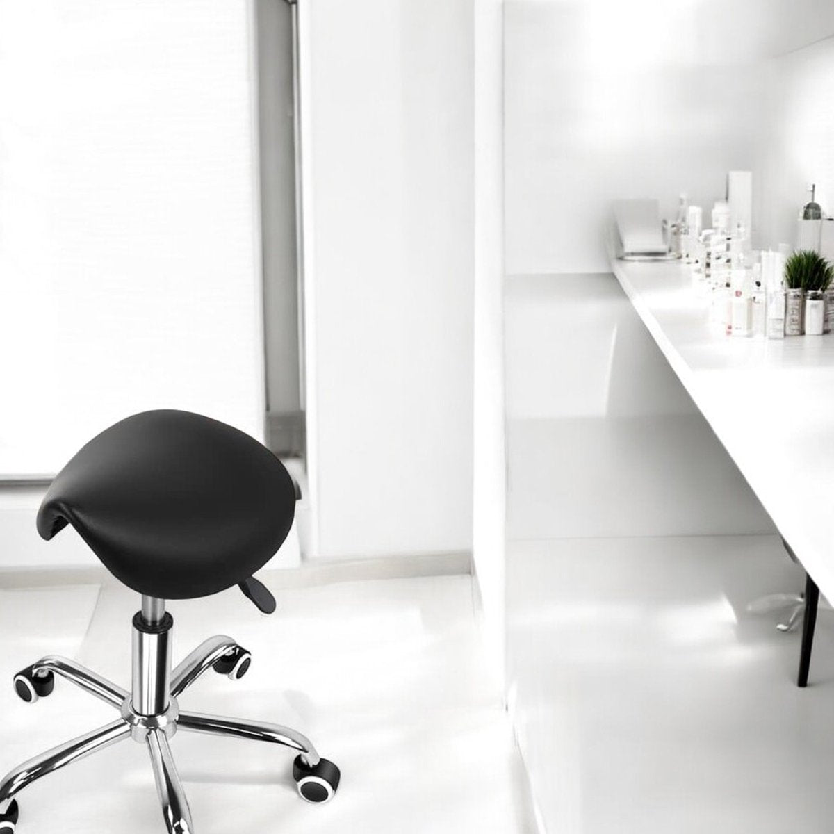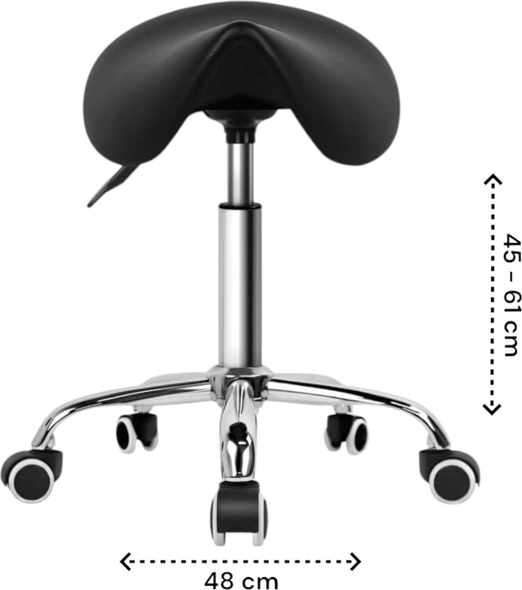Ben je op zoek naar een comfortabele make-up stoel die niet alleen functioneel is, maar ook stijlvol in je interieur past? Deze zwarte zadelkruk met zilverkleurige accenten is precies wat je zoekt! Perfect voor iedereen die langdurig zitwerk verricht, zoals visagisten, schoonheidsspecialisten, kappers, of als je gewoon een comfortabele stoel nodig hebt voor thuis of op kantoor. Deze zadelkruk is ontworpen om je houding te verbeteren en rugklachten te verminderen door de ergonomische zitting.