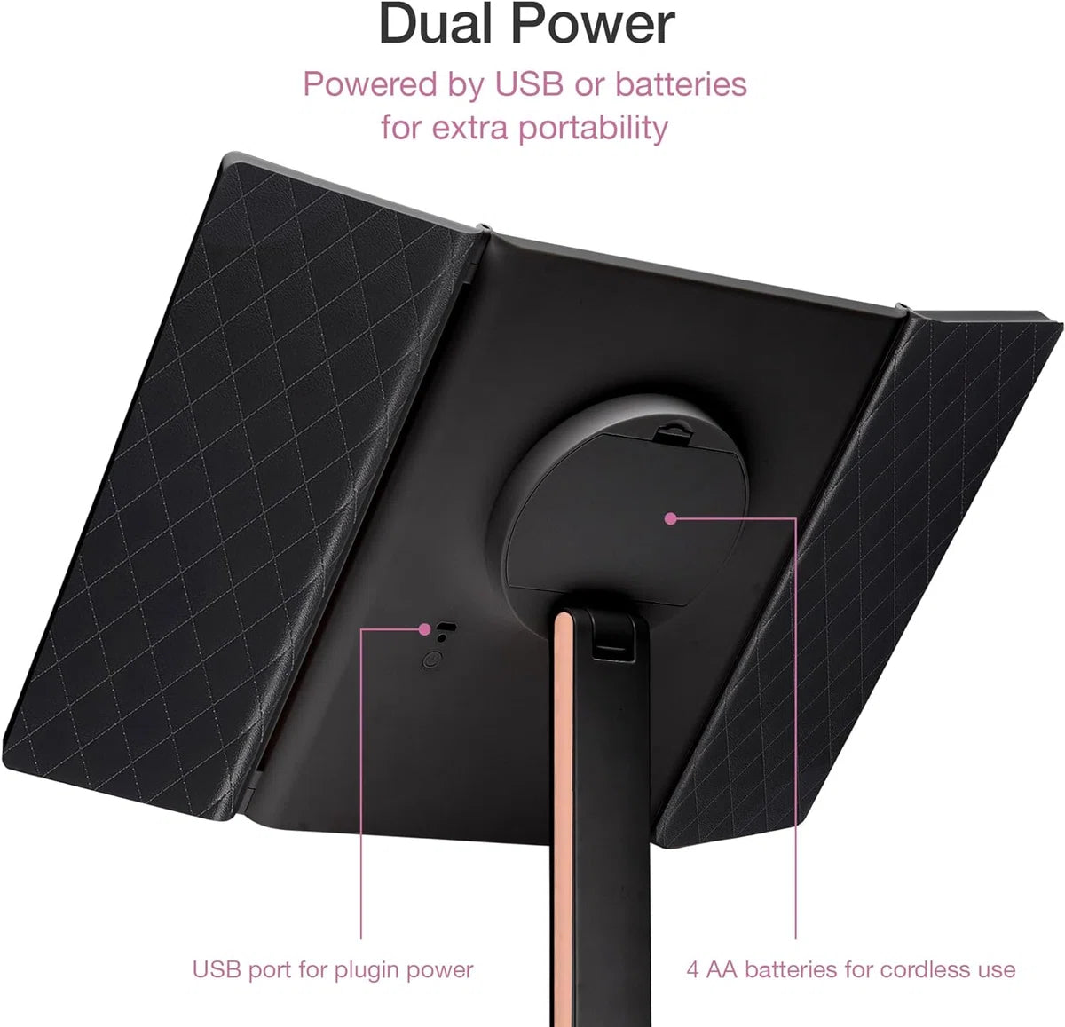 Dual Power: De energiebesparende slimme LED-lampjes schakelen automatisch uit na 30 minuten. Je kunt de spiegel voeden met de meegeleverde USB-kabel of met 4 AA-batterijen, waardoor je flexibel bent in het gebruik.