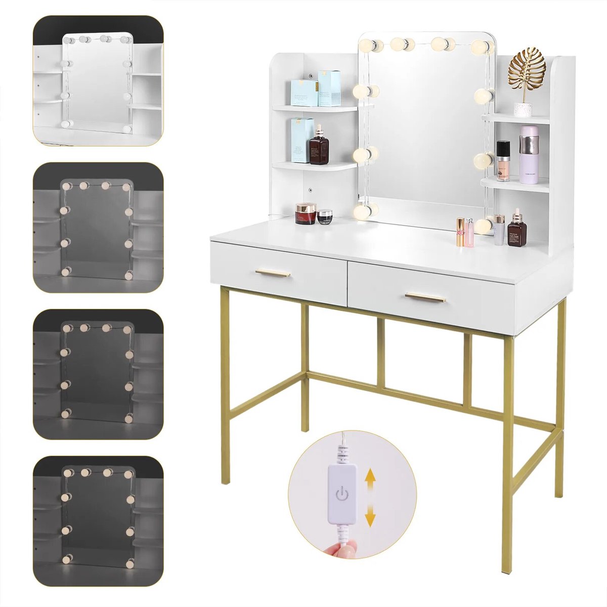 Make Up Tafel - Kaptafel Met Spiegel - Kaptafel met speigel en verlichting - Slaapkamer Luxe - Wit/Goud
