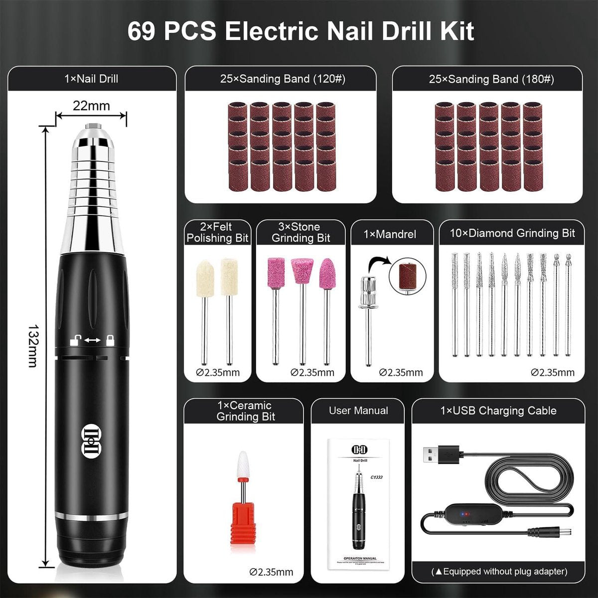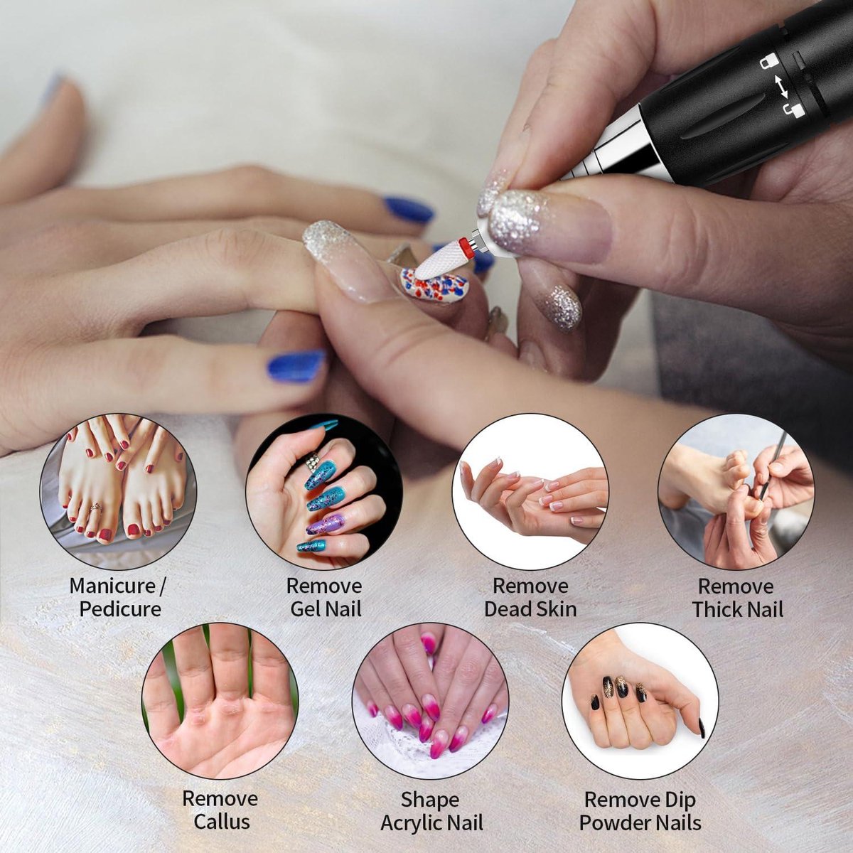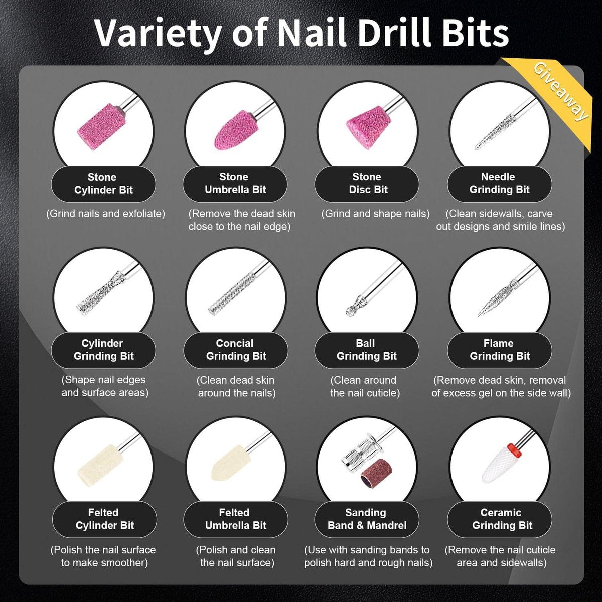 De nagelboormachine wordt geleverd met 6 speciale zeshoekige nagelboren en 10 schuurbanden, waardoor je diverse nagelverzorgingsacties kunt uitvoeren, zoals slijpen, vijlen, knippen, polijsten, en meer. Het is geschikt voor thuisgebruik, nagelscholen, nagelsalons en meer, voor een complete nagelverzorgingservaring.