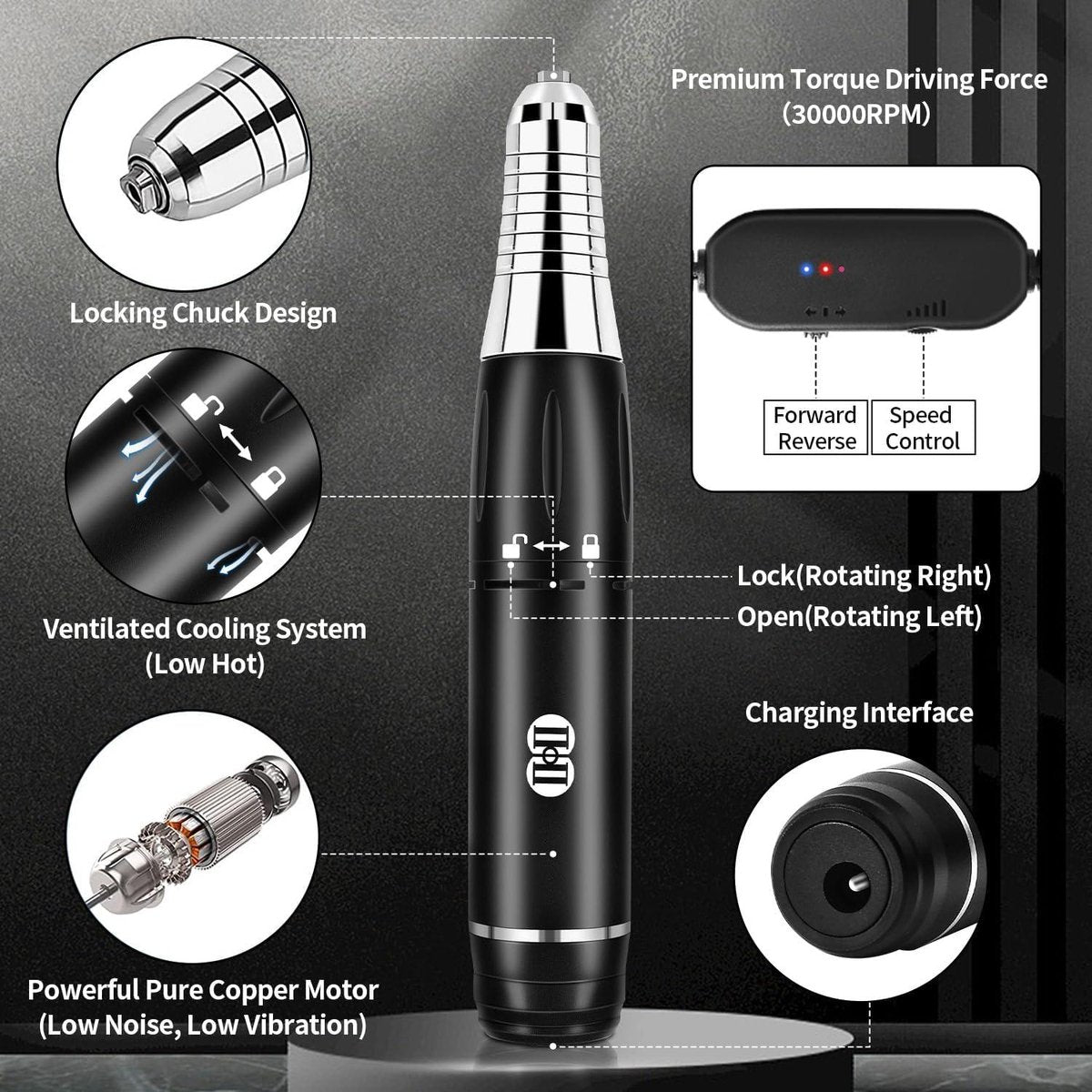 De nagelboormachine is uitgerust met 4 instelbare snelheden en ondersteunt voorwaartse en achterwaartse richting. Met een krachtige motor zorgt deze boor voor een nauwkeurig nagelslijpeffect en een salonwaardige afwerking. De oplaadbare lithiumbatterij biedt langdurig draadloos gebruik voor ultieme flexibiliteit.