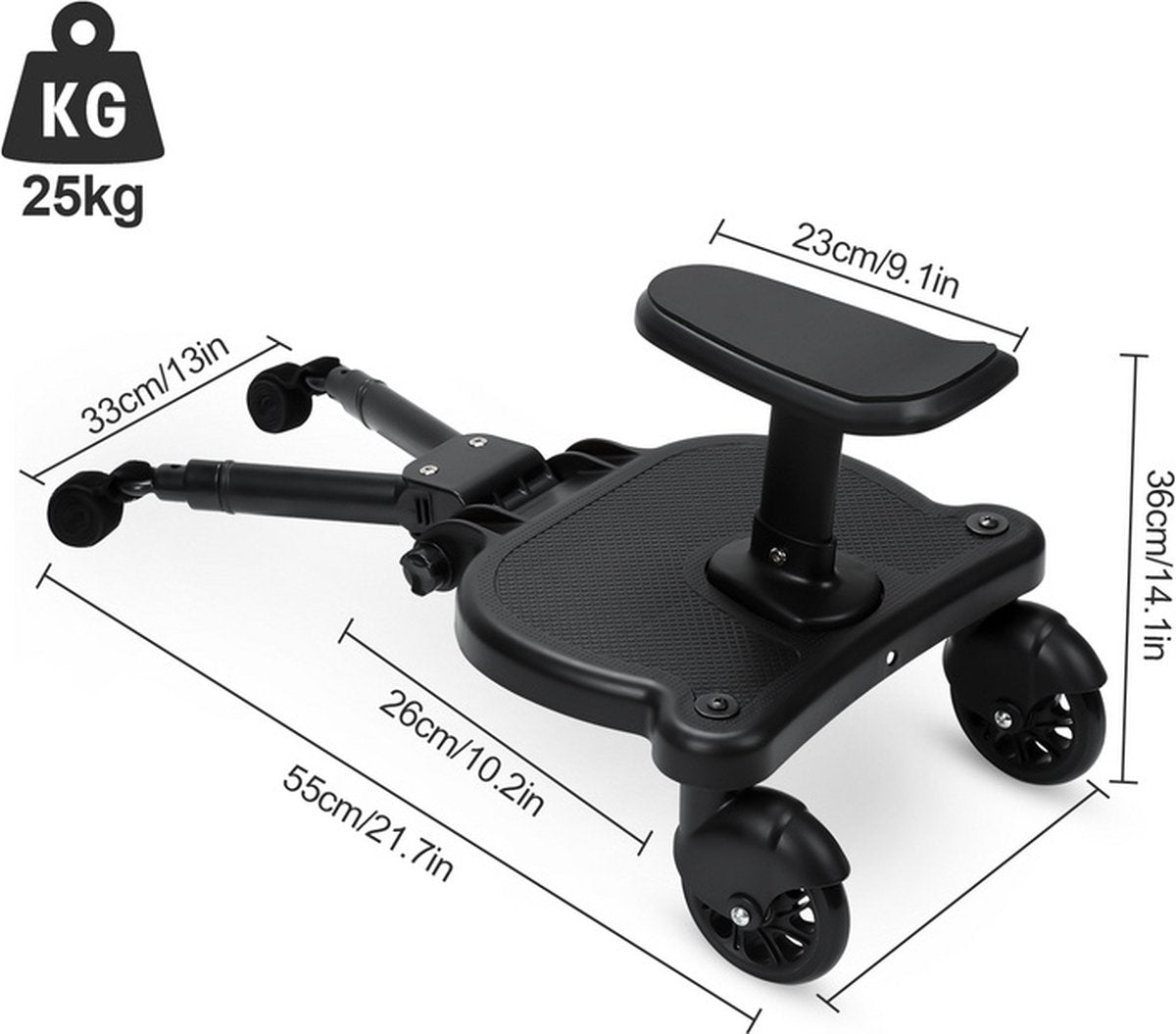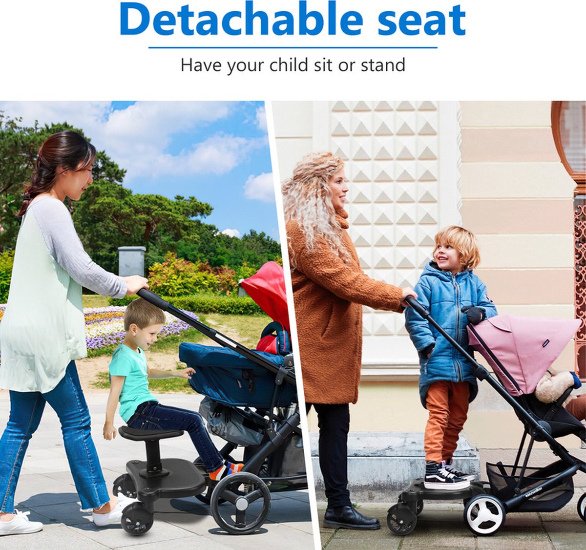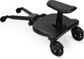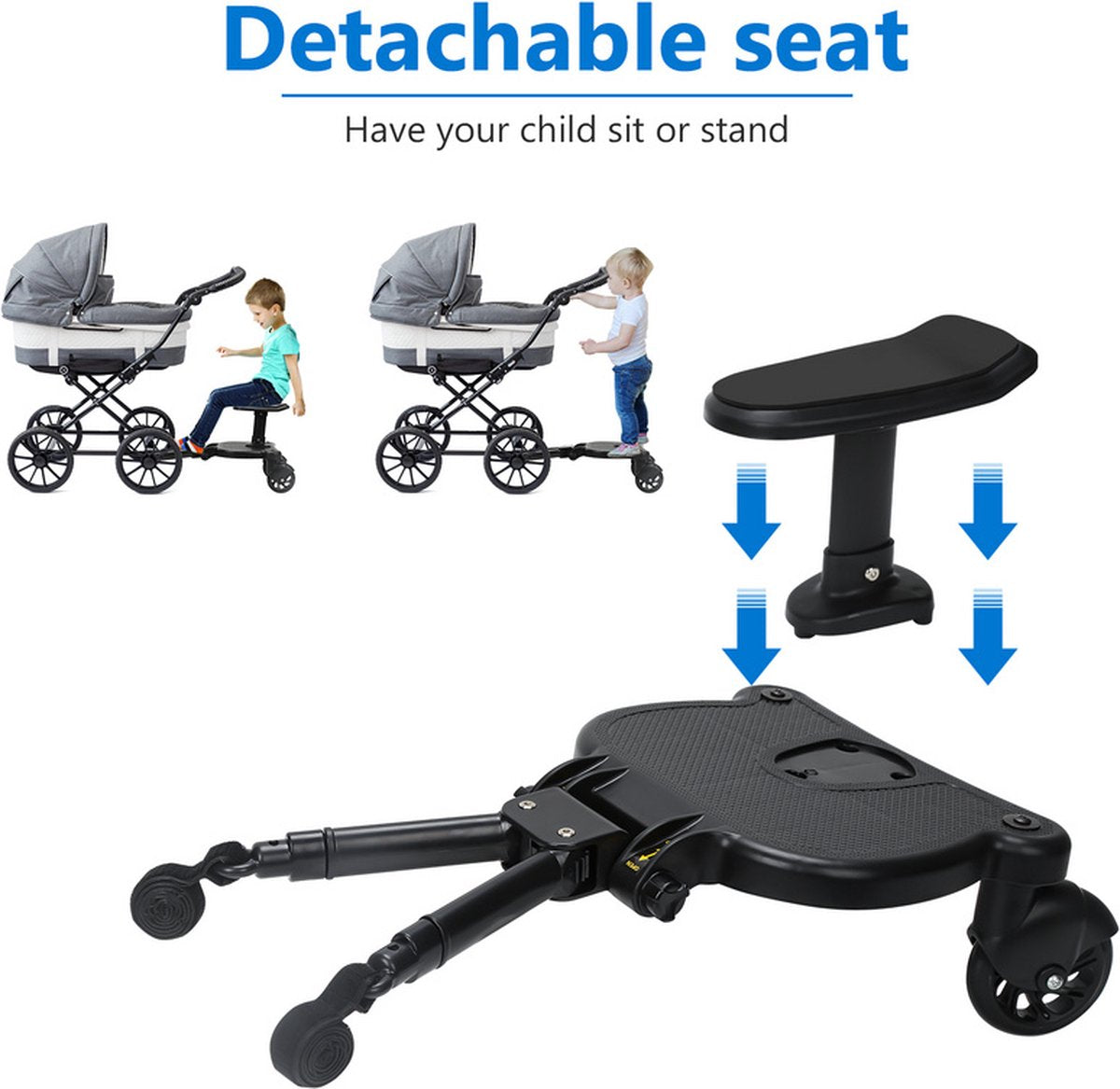 Meerijdplankje Universeel - Meerijdplankje met zitje voor aan de kinderwagen of buggy - Dubbele stevige wielen - Extra stabiel - Verstelbaar - Zwart