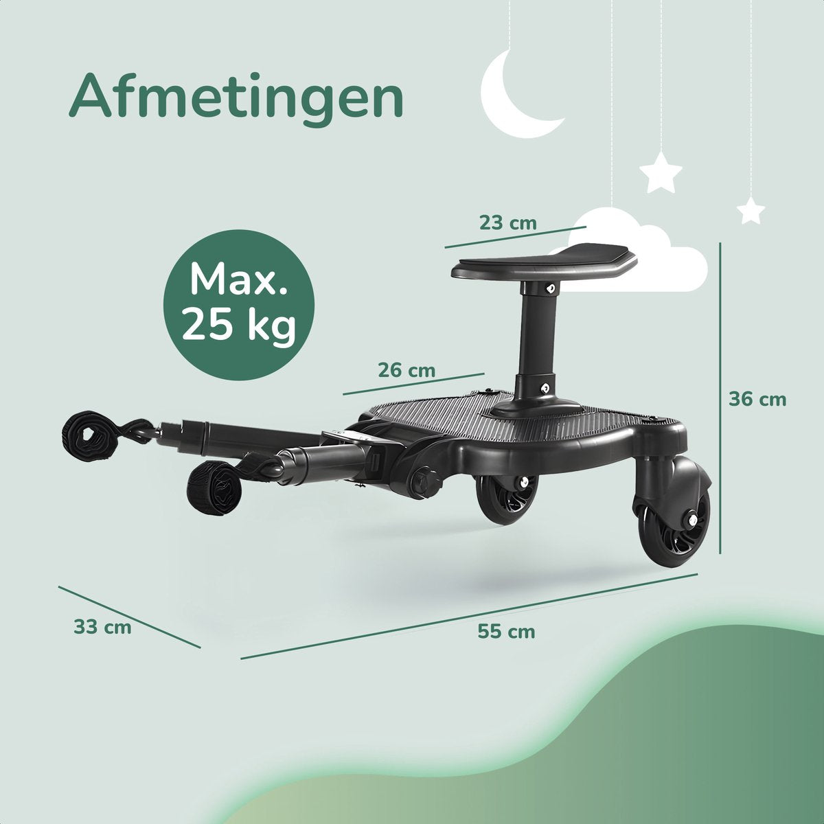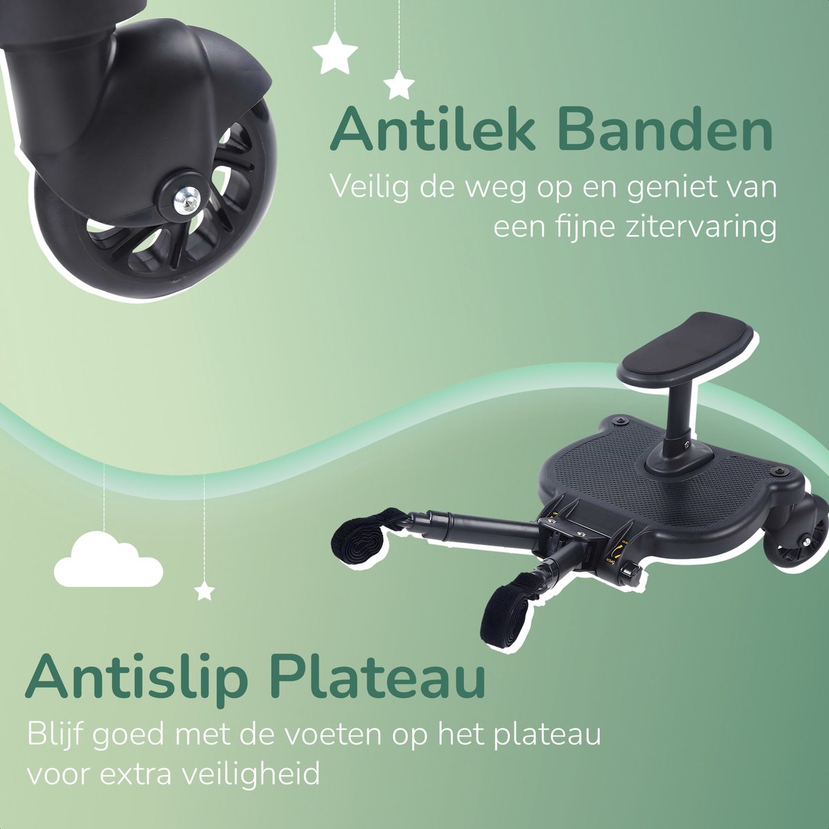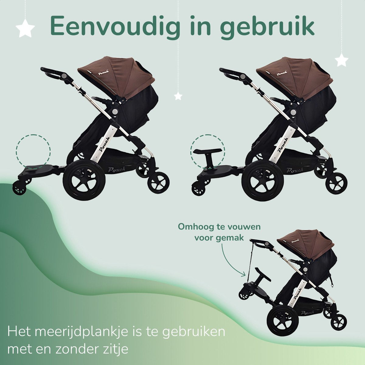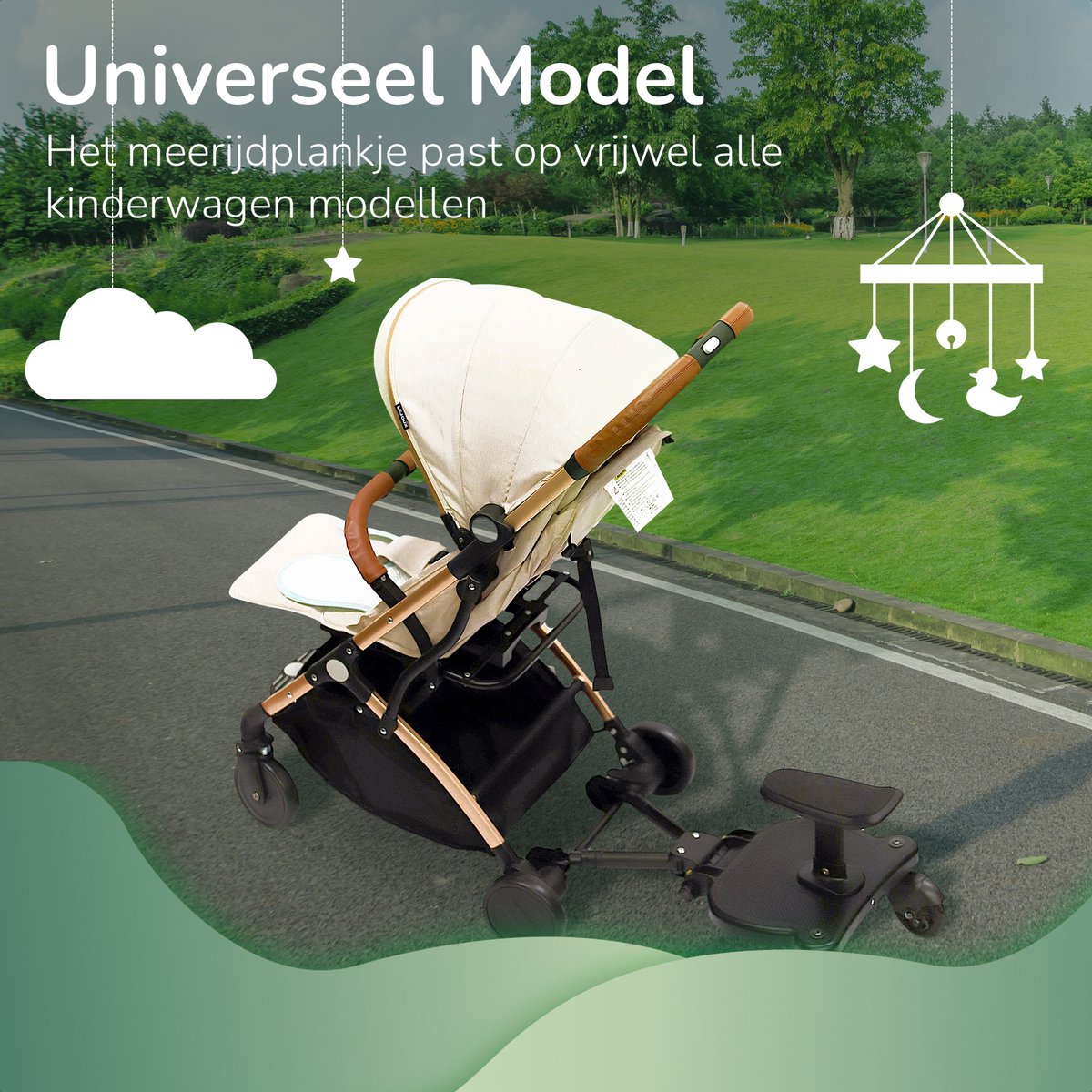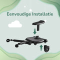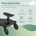 Ons universele meerijdplankje, speciaal ontworpen voor ouderlijk gemak en kindercomfort, maakt kostbare momenten delen met je kinderen gemakkelijk. Geen vermoeide benen of ruzies over wie in de kinderwagen mag zitten. Laat je kind moeiteloos reizen terwijl jij de controle behoudt. Het is de perfecte oplossing voor ouders met kinderen van verschillende leeftijden, of zelfs tweelingen, om het leven onderweg soepeler en plezieriger te maken. Geen gedoe meer met zware kinderwagens of drukke straten; ons meerijdplankje maakt jouw reis eenvoudiger en aangenamer.