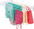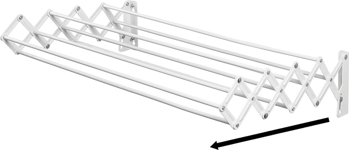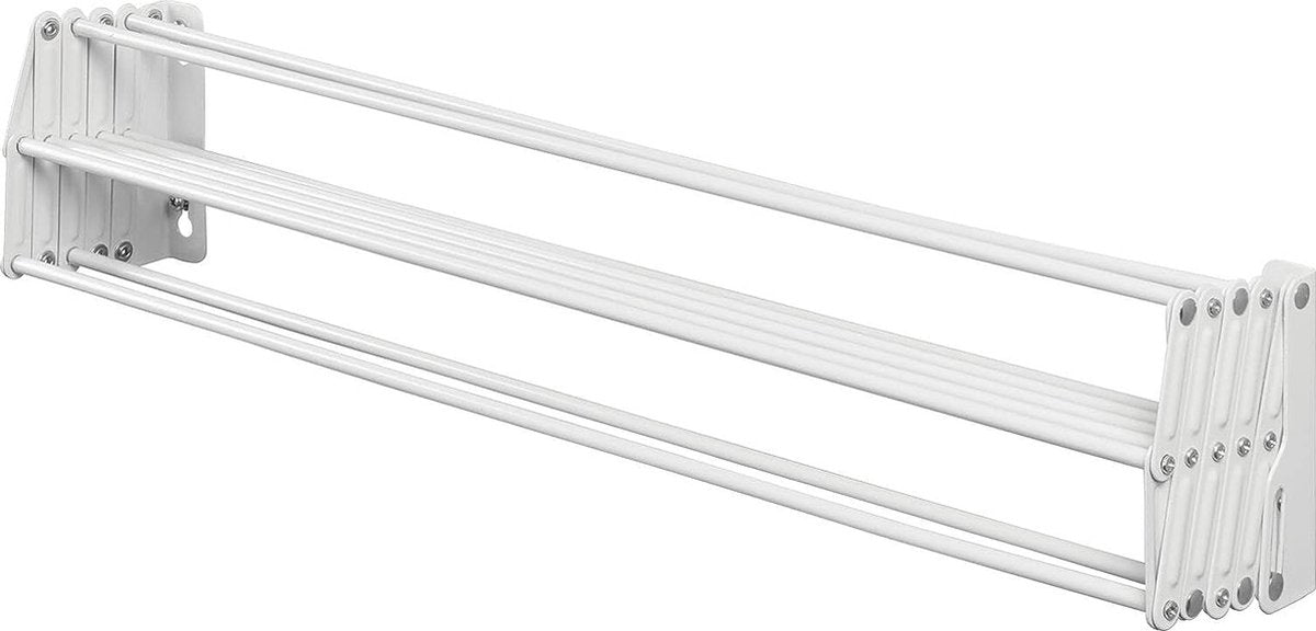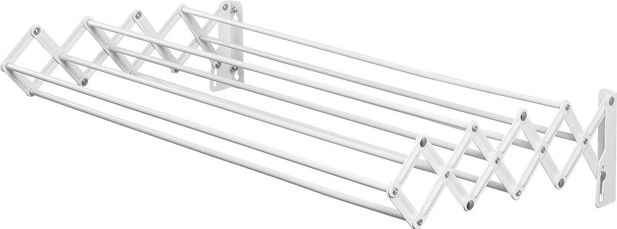 Veel ophangruimte: deze uitschuifbare kledingdroger is uitgerust met 9 kledingrails en biedt daardoor ongeveer 5,5 royale meters om de was op te hangen en te drogen. Slim ontwerp: met dit droogrek kunnen de gewassen kleren ideaal drogen in de frisse lucht. Na gebruik kan de standaard worden ingeklapt aan de muur om ruimte te besparen. Compact model: dit uitschuifbare wasrek is ideaal voor kleinere wasruimtes. Met de meegeleverde bevestigingsaccessoires kan het eenvoudig op de gewenste plaats worden bevestigd. Duurzame afwerking: de kledingdroger aan de muur is gemaakt van duurzaam metaal in het wit. Het zal dus een duurzame hulp zijn in het huishouden. Compacte afmetingen: wanneer uitgeschoven, meet het wasrek 59,9 cm x 38,9 cm x 11,9 cm en biedt het zoveel ophang