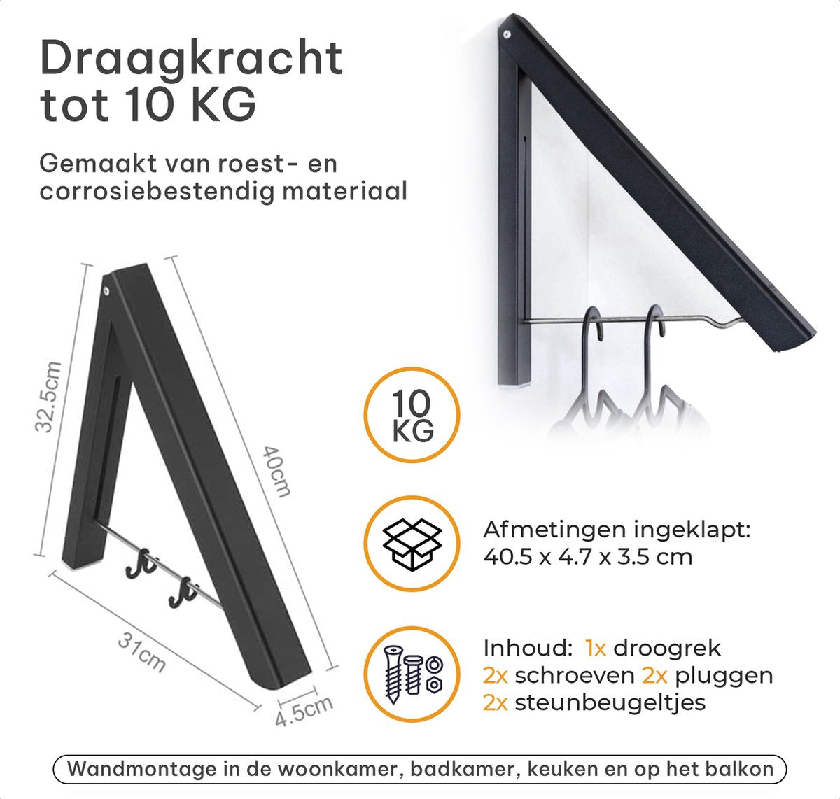 • Functioneel en ruimtebesparend laten drogen en ophangen van tot 10 KG aan kleding