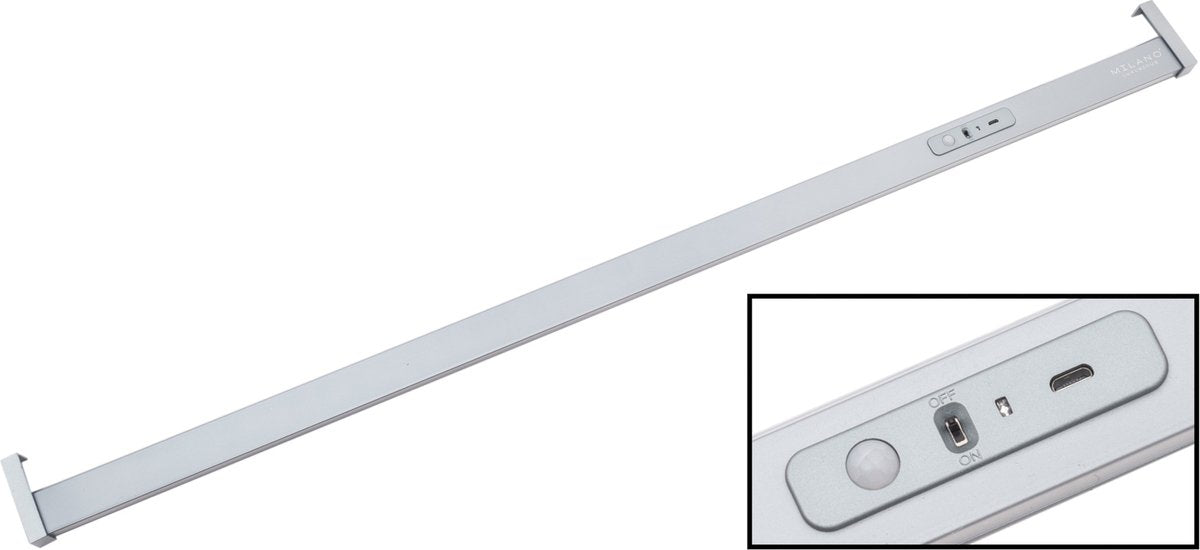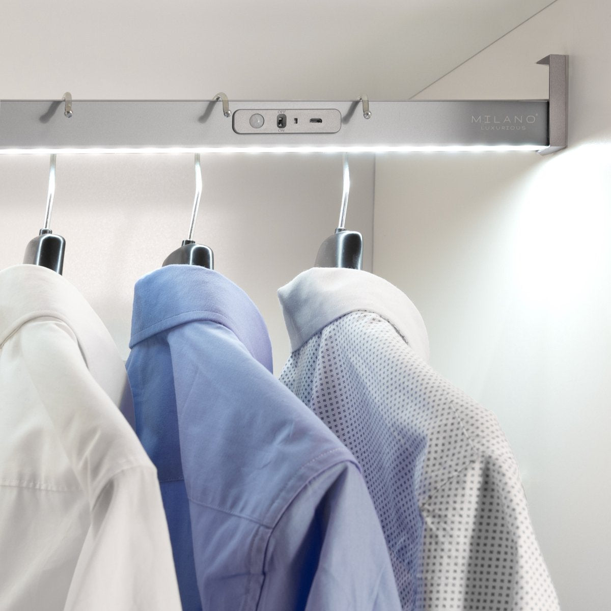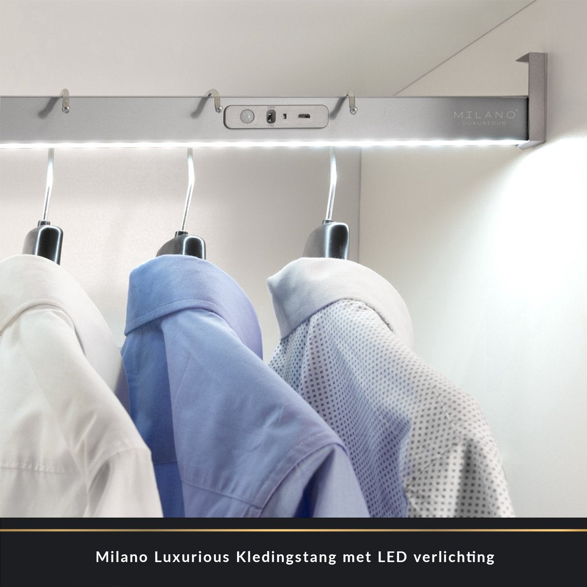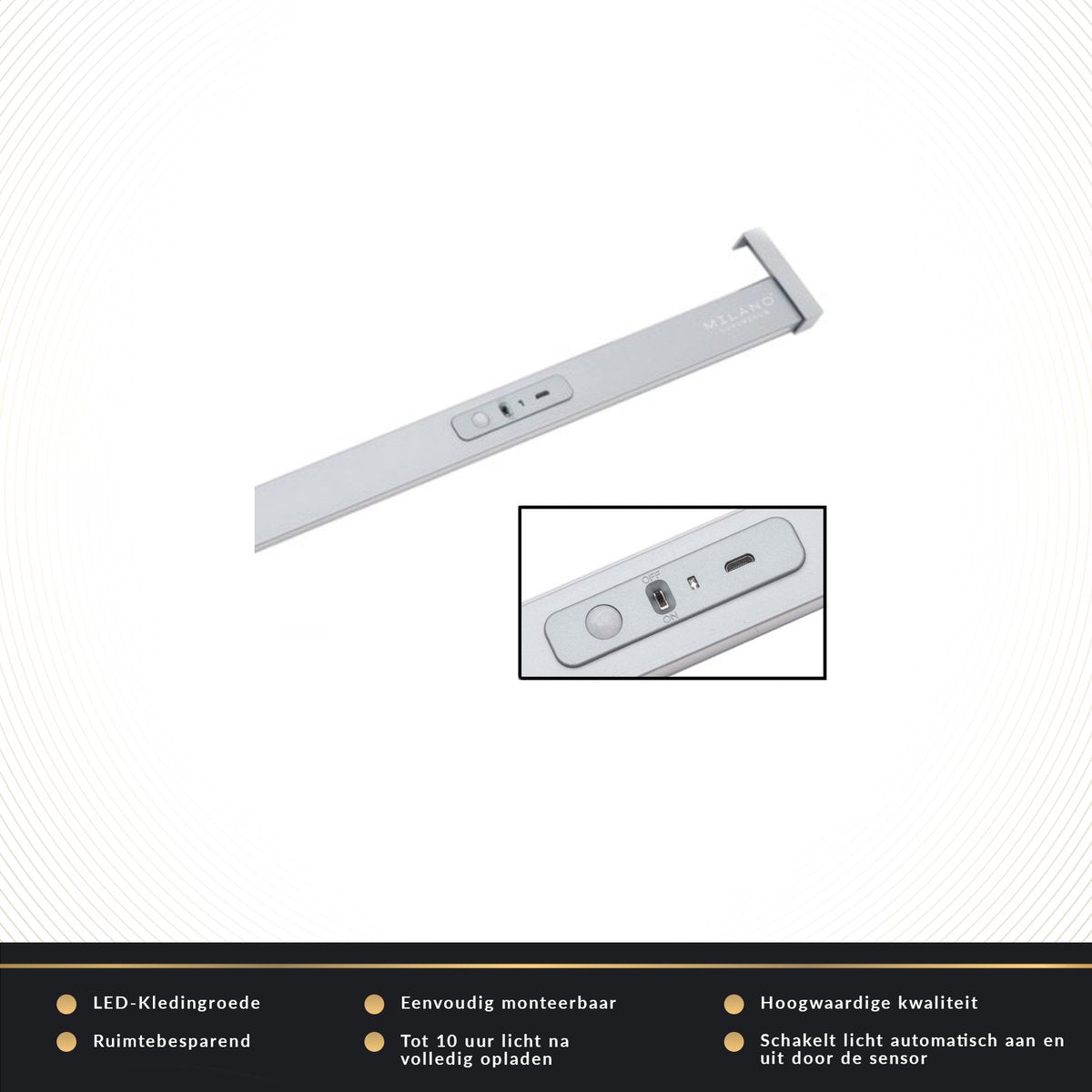Milano Luxurious kledingstang met LED verlichting bewegingsmelder – 120 cm - Kastroede met natuurlijk wit licht – Oplaadbare kledingroede met sensor en aan/uit schakelaar – Zilvergrijs