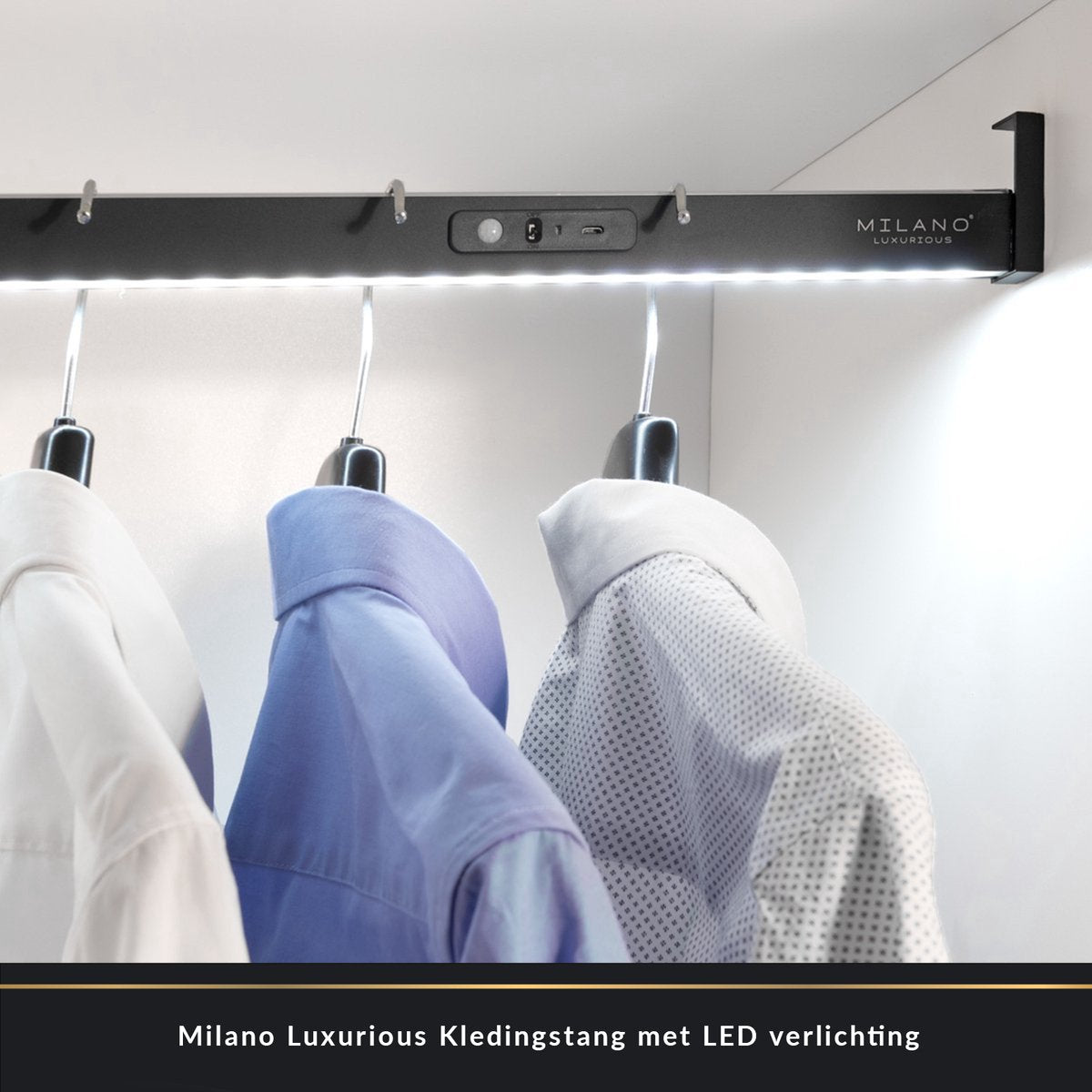 Milano Luxurious kledingstang met LED verlichting bewegingsmelder – kastroede met natuurlijk wit licht – oplaadbare kledingroede met sensor en aan/uit schakelaar – 90 cm – zwart