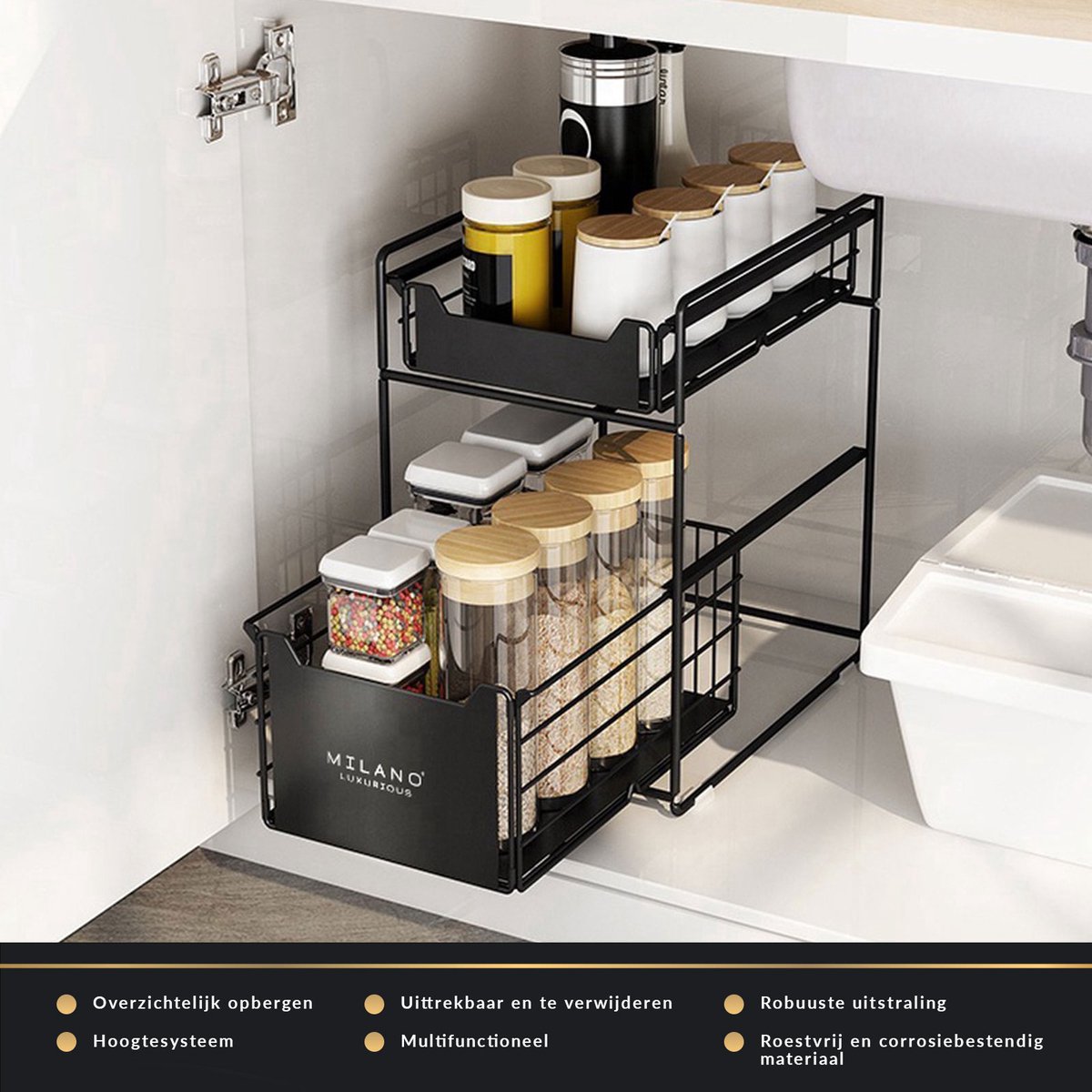Milano Luxurious organizer lade Zwart – keuken ladekast – gootsteenkast organizer – opbergrek voor het aanrecht – tweelaags ladesysteem – opslag voor keukenkast of badkamerkast – maat L