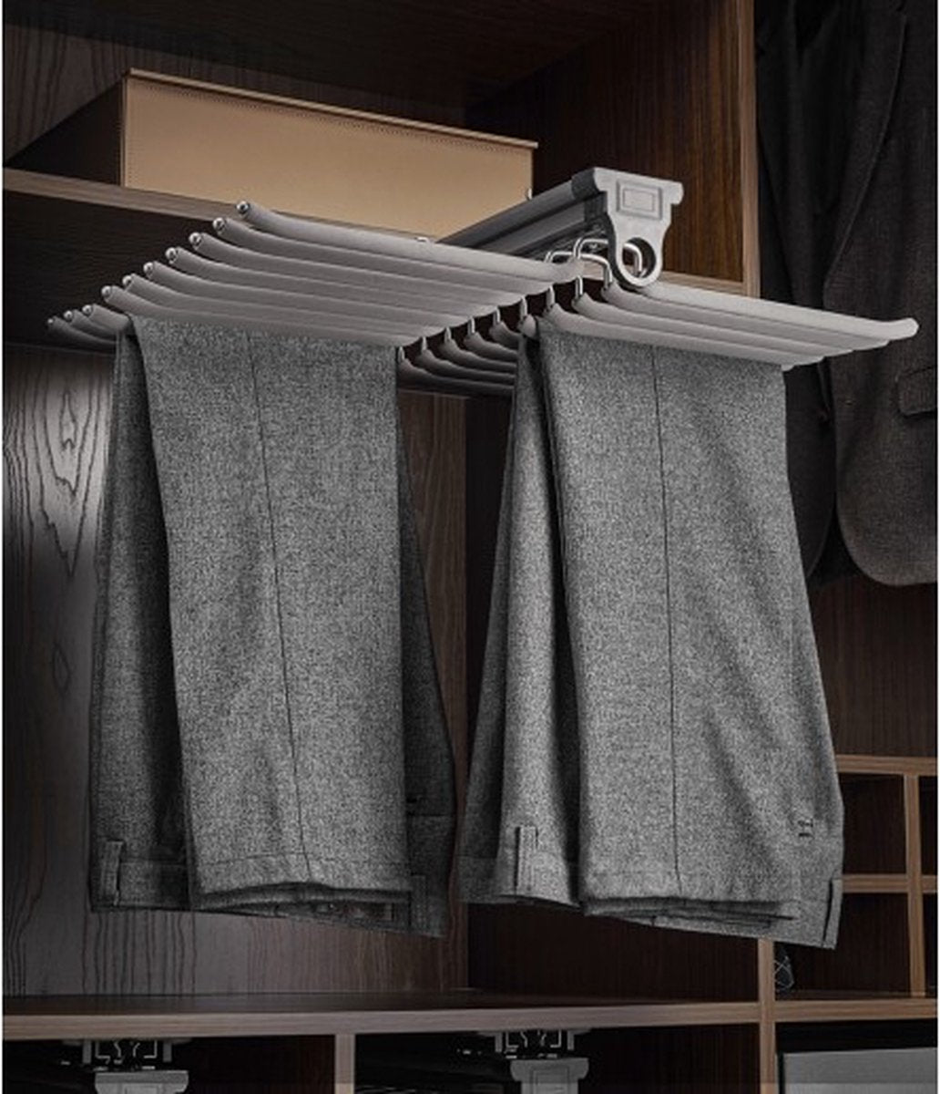 De soft-close functie zorgt voor een geruisloze en zachte terugkeer van de hanger, terwijl de anti-slip beugels elk risico op het afschuiven van broeken wegnemen. Met deze pantalonhouder hoef je je nooit meer zorgen te maken over rommelige stapels en gekreukte broeken, je broeken hangen veilig en zijn altijd klaar voor gebruik.