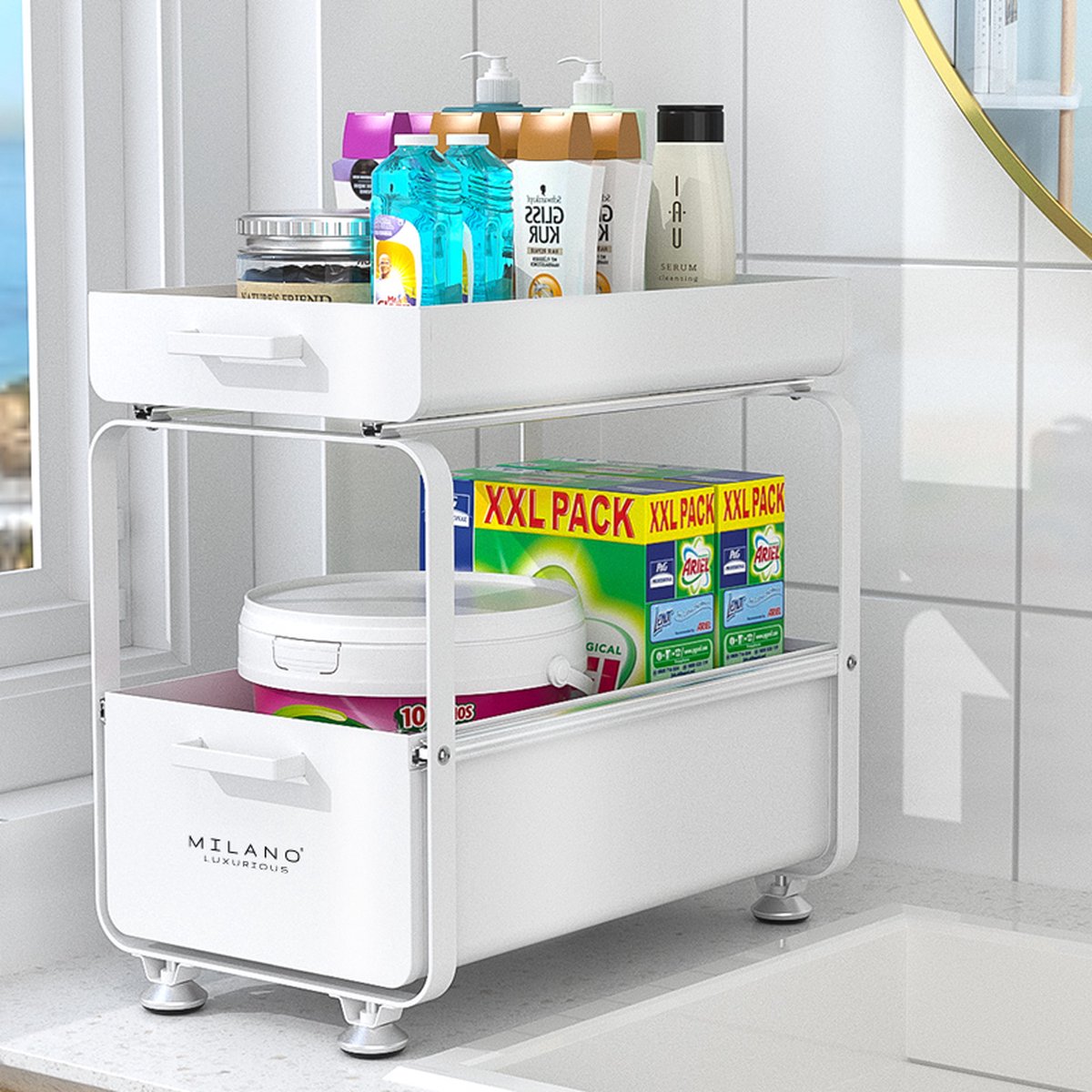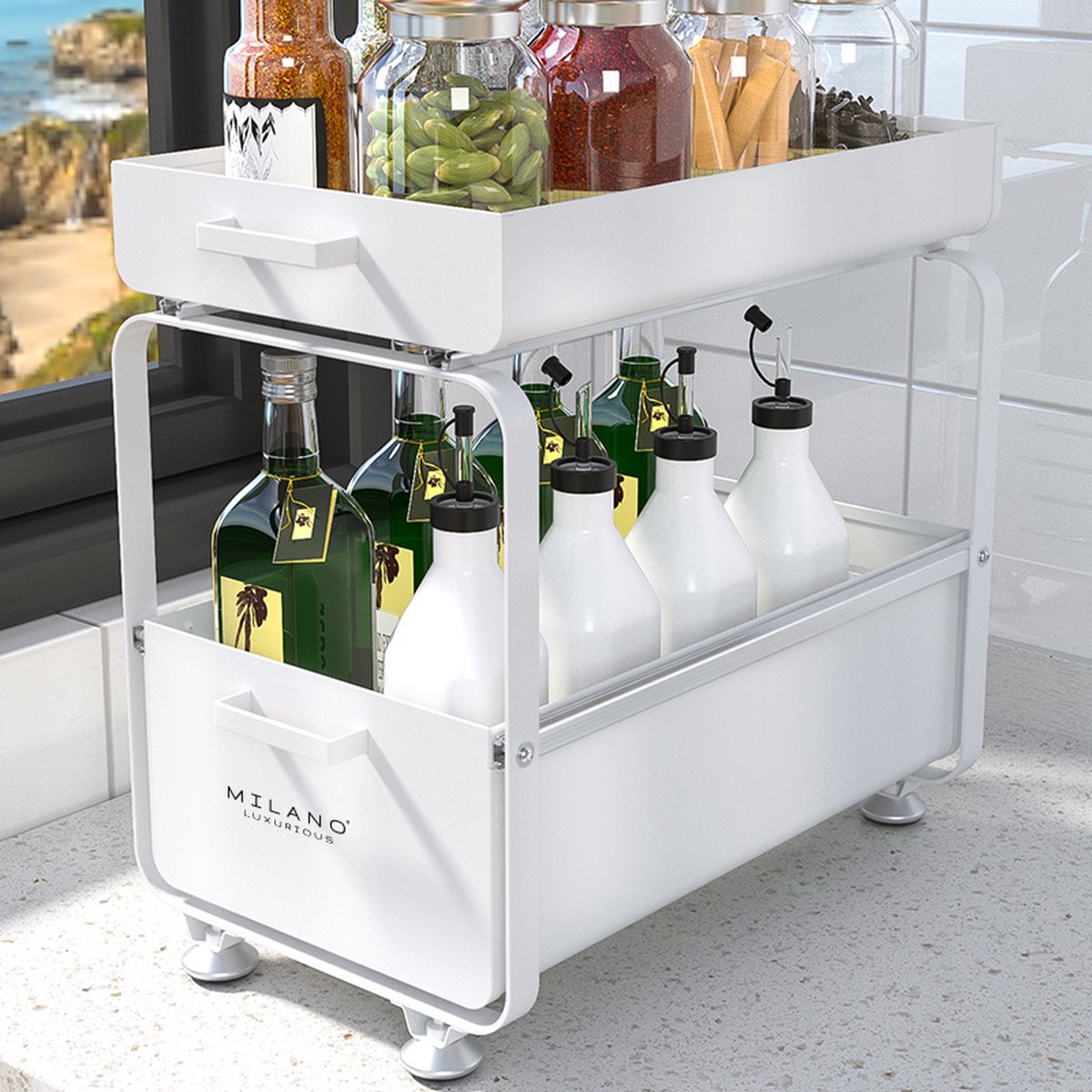 Milano Luxurious uittrekbare organizer lade wit– Keuken ladekast – Gootsteenkast organizer – Opbergrek voor het aanrecht – Tweelaags ladesysteem – Opslag voor keukenkast of badkamerkast
