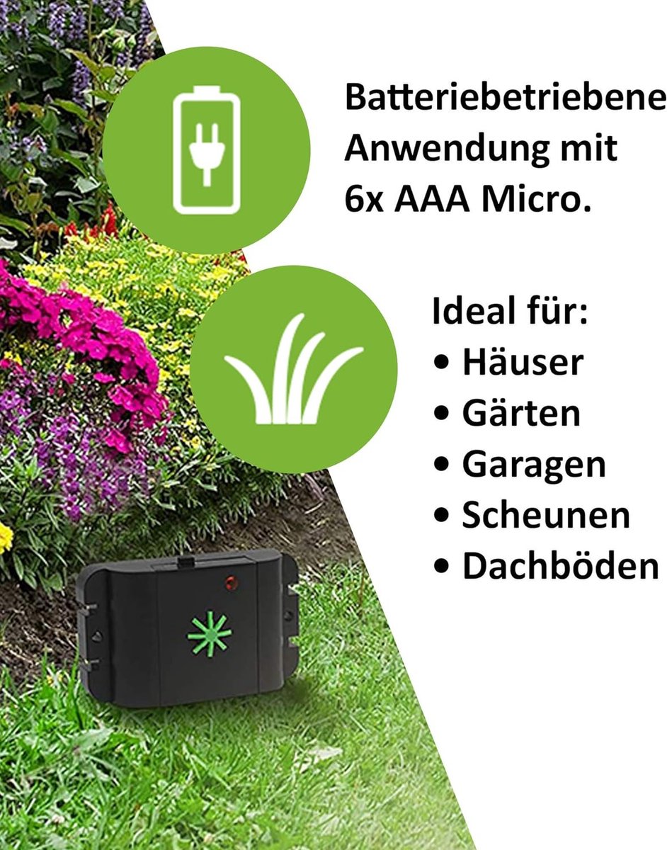 Effectieve ultrasone technologie: De ultrasone afweer van het apparaat zorgt voor een krachtige maar diervriendelijke manier om ongewenste dieren af te weren. De hoge tonen zijn storend voor honden en katten, waardoor ze uw tuin zullen vermijden.
