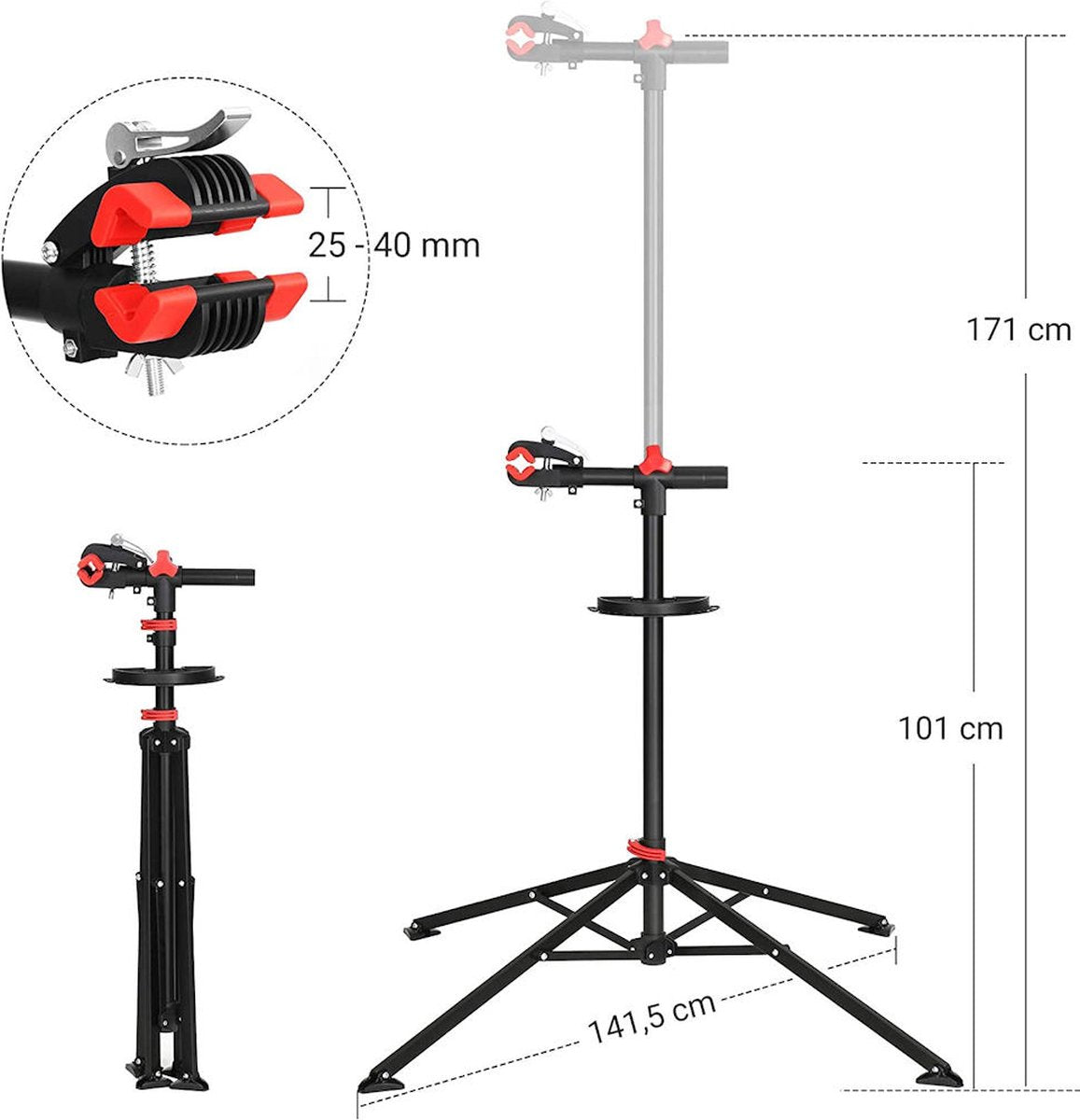 De standaard is eenvoudig in hoogte verstelbaar. Om hem in hoogte te verstellen gebruik je de klem die aan de buis vastzit. Je past de hoogte daarmee aan tussen de 101 en 171 cm. Zo stel je fietsreparatiestandaard eenvoudig in op de juiste werkhoogte.