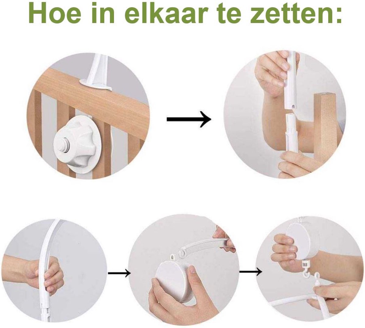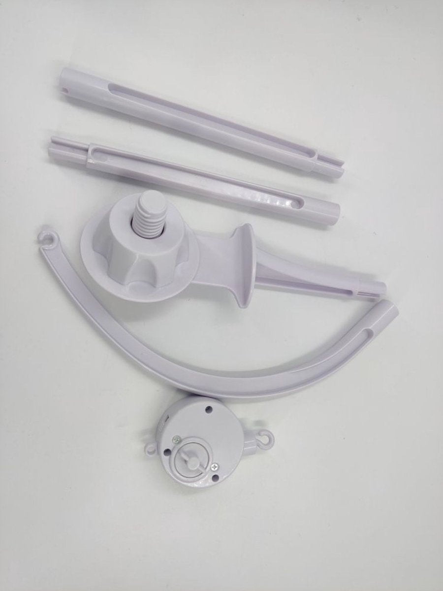 De muziekarm is extra lang omdat deze vilten mobiels ook lang zijn. De arm is 88cm. Je kunt, indien gewenst, 1 van de 3 zelf in elkaar te zetten stukken gemakkelijk verwijderen, dan houd je een muziekarm over van 66cm. 66cm is een normale maat is voor een muziekarm. Dus je kunt de arm voor zowel deze lange vilten mobiel gebruiken als er een andere kortere mobiel aan hangen. Multifunctioneel! Het muziekje speelt om en nabij 4 minuten af met het klassieke baby slaap muziekje.