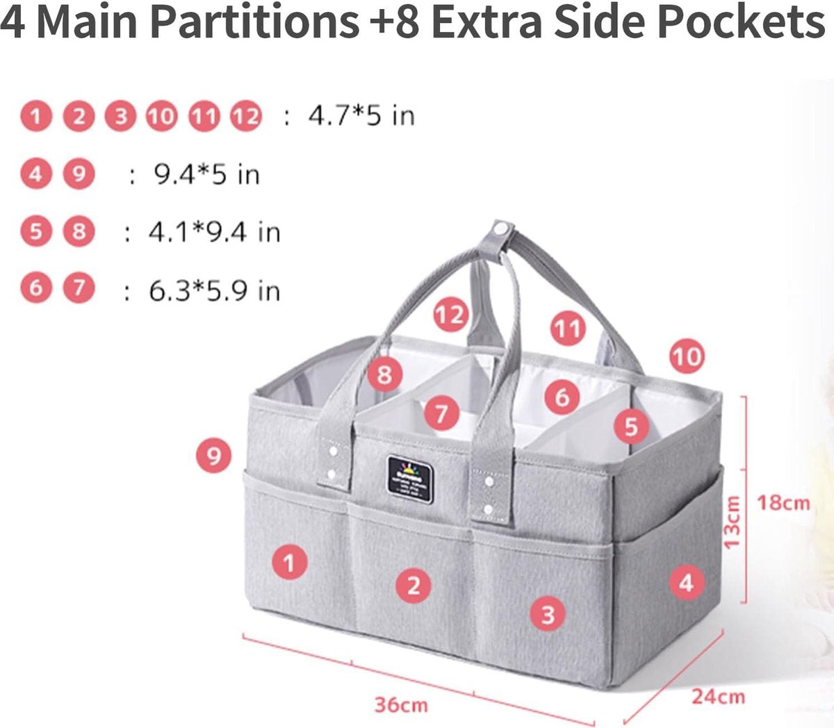 De babyluierorganizer biedt voldoende ruimte voor de belangrijkste babybenodigdheden. Met zijn 4 hoofdvakken en 8 zijvakken kunnen klein speelgoed, kleding, melkflessen en meer gemakkelijk worden opgeborgen. Het viltmateriaal is niet alleen van hoge kwaliteit, maar ook huidvriendelijk en veilig voor je baby. De waterdichte voering zorgt ervoor dat de organizer gemakkelijk schoon te maken is en niet snel vuil wordt.