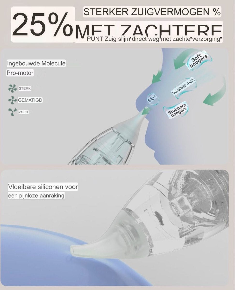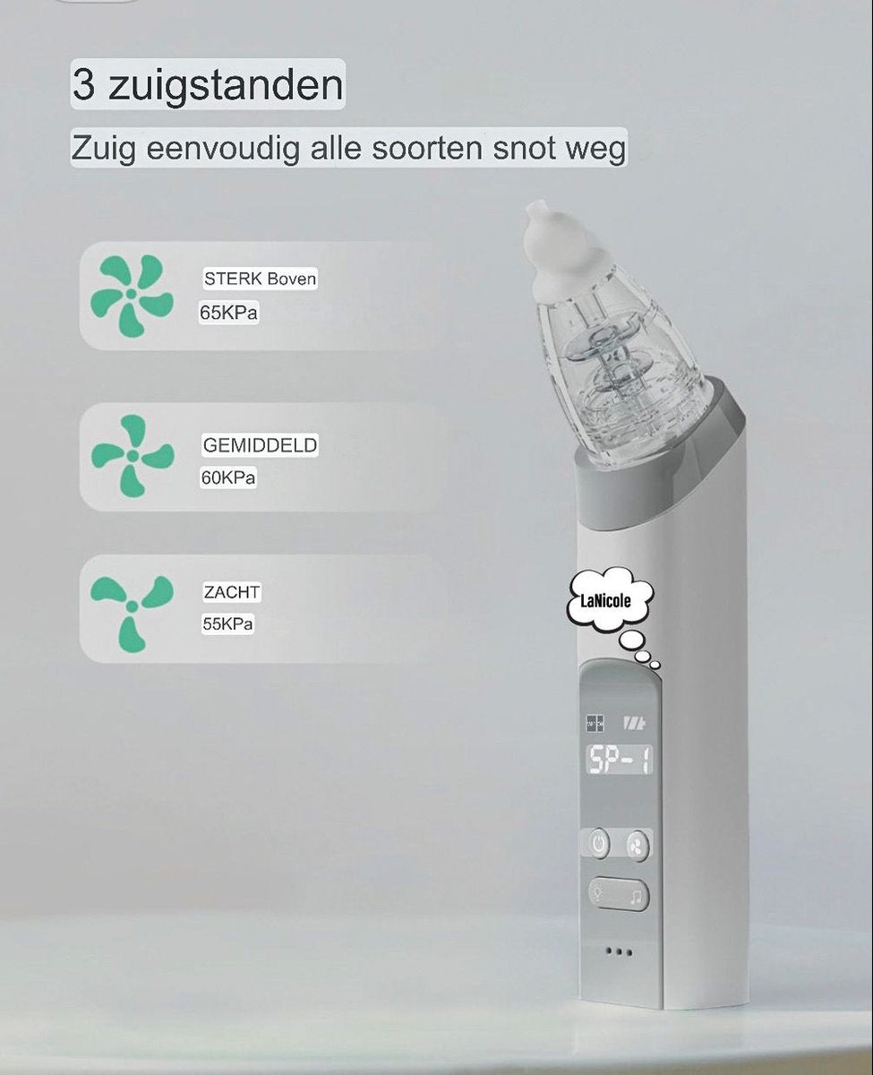 Heeft jouw kindje vaak last van een verstopte of snotterige neus? De Neusreiniger zorgt in een paar seconden voor een snotvrije neus. De elektrische neusreiniger heeft 3 verschillende zuigsterktes. Zo kan je kind er rustig aan wennen.