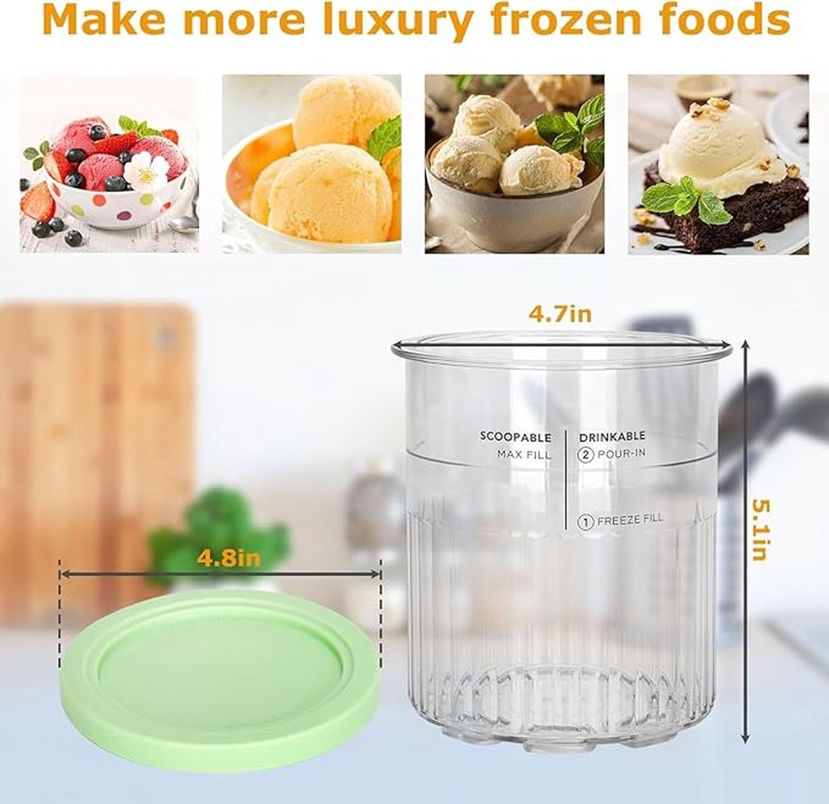 - Speciaal ontwerp met concave convexe textuur, sterke grip, antislip en meer kunstmatig. Het transparante design en de deksels in verschillende kleuren kunnen verschillende ijsaroma's beter onderscheiden.