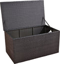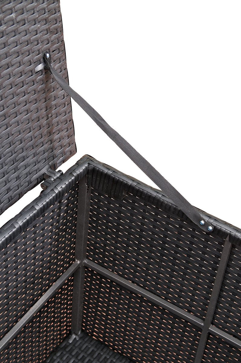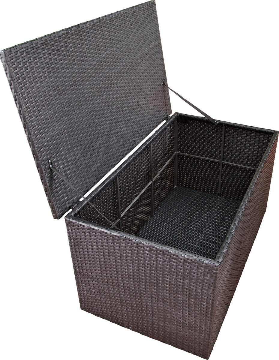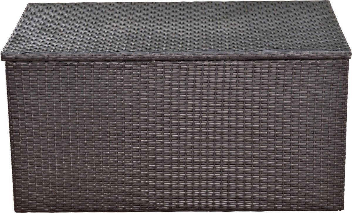 Deze kist van polyrotan is de ideale opbergplaats voor bijvoorbeeld de kussens van je tuinmeubelen. Polyrotan ziet eruit als conventioneel rotan, maar heeft aanzienlijk meer voordelen, is zeer duurzaam en rafelt niet snel. Het is UV-bestendig en kan gemakkelijk uren in de zon staan zonder kleurdiepte te verliezen. Het is absoluut waterdicht en uiterst onderhoudsvriendelijk. In het deksel is een folie verwerkt, die aan beide zijden gevlochten is, om de inhoud te beschermen tegen vocht van bovenaf. Houd er rekening mee dat dit niet aanwezig is in de rest van de romp en het artikel dus niet waterdicht is.