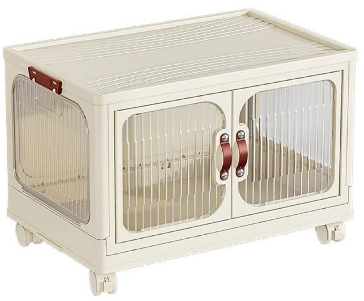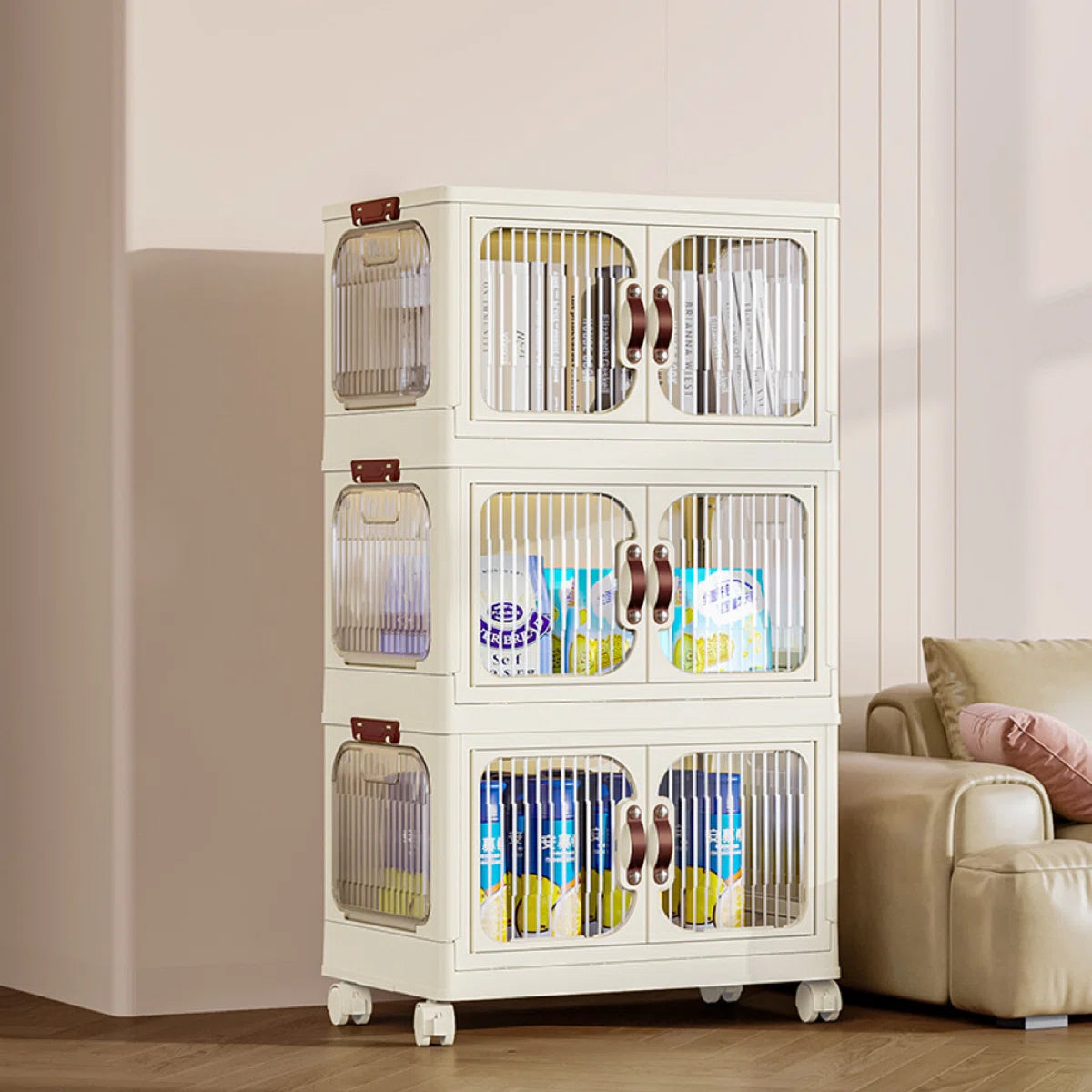 Met de dubbele voordeuren aan de voorkant of het deksel aan de bovenkant kun je gemakkelijk bij je spullen. De magneet aan de voorkant zorgt ervoor dat de deuren moeiteloos sluiten. Met de meegeleverde wielen kun je de opbergdozen/kast door je huis verplaatsen.