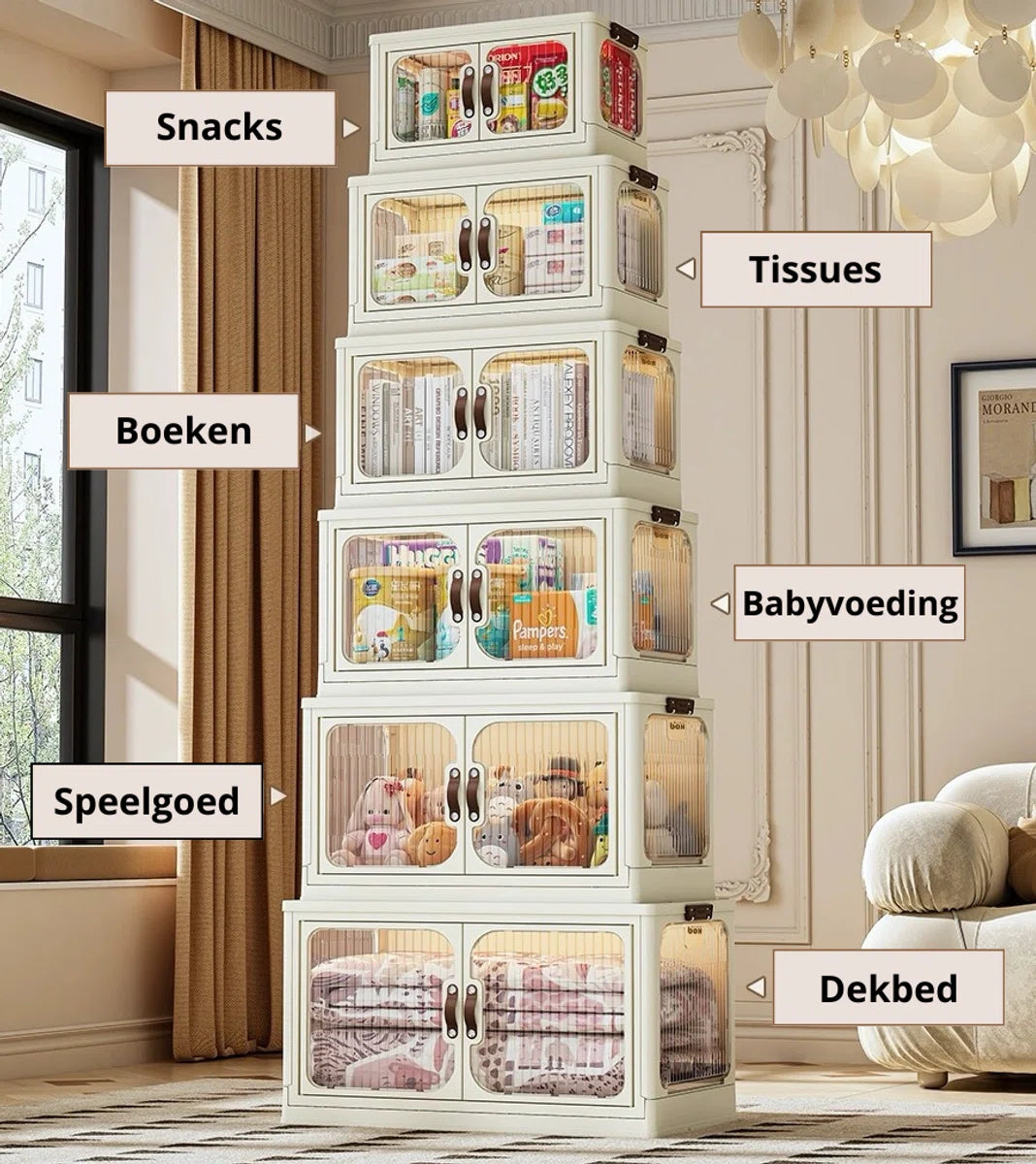 De opbergdozen zijn stapelbaar en kunnen worden samengevoegd tot een handige kast die overal in huis kan worden geplaatst, van de keuken tot de slaapkamer. Met de meegeleverde wielen zijn ze eenvoudig te verplaatsen. Je kunt de dozen openen via zowel de dubbele voordeuren aan de voorkant als het deksel aan de bovenkant. Dankzij de magneet aan de voorkant sluiten de deuren moeiteloos.