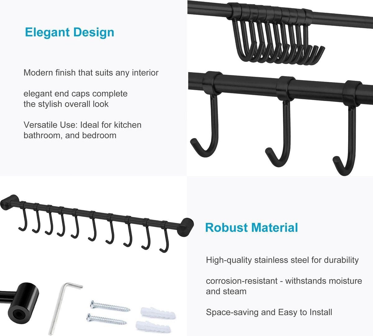 • Verplaatsbare haken voor flexibiliteit in het ophangen van spullen