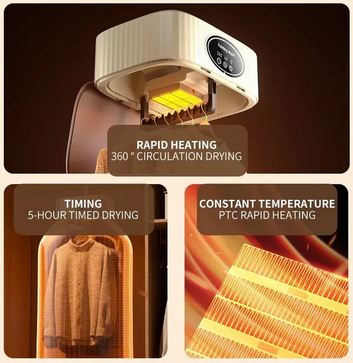 Eenvoudige Installatie en Gebruik: De droger is eenvoudig te installeren en te gebruiken. U hoeft alleen de kleding op het rek te hangen, de droger aan te zetten, en binnen een korte tijd zijn uw kledingstukken droog en klaar voor gebruik. Dit maakt het een ideale oplossing voor drukke huishoudens en reizigers die geen tijd willen verliezen.