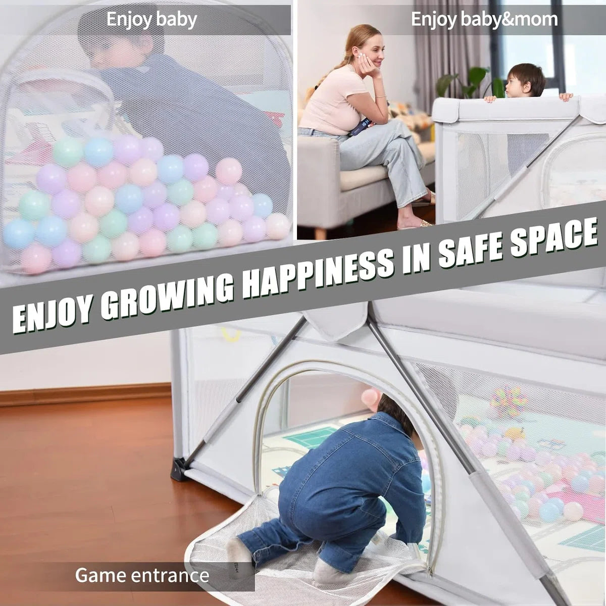 - Groot speelgebied: de speelbox met twee poortjes is tot l x b x h: 120 x 160 x 68 cm ruimte, en ouders maar niet de kinderen kunnen de ingang van de speelbox van buitenaf openen om de kinderen naar buiten te laten, zodat meer kinderen en hun ouders in een veilige ruimte het geluk van samen opgroeien kunnen voelen.