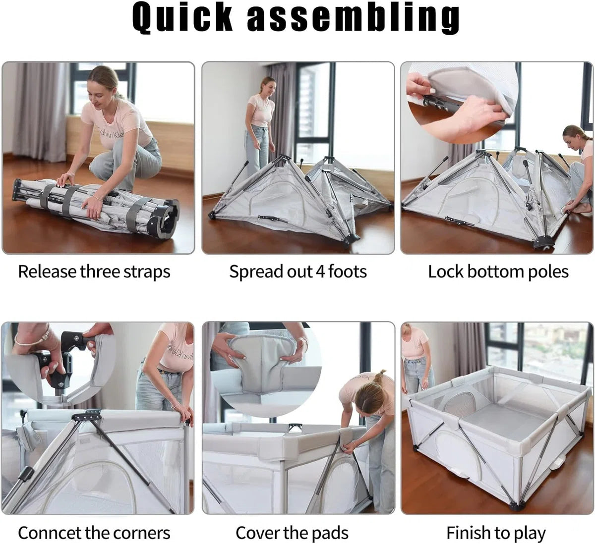 - Snelle montage: na drie jaar onderzoek en ontwikkeling. Er is een opvouwbare omheining voor kinderen gelanceerd. Vergeleken met andere vouwhekken lost dit snel in elkaar te zetten hek het probleem van het ongemak bij het transport op. (Opmerking: de mat is niet bij de levering inbegrepen).