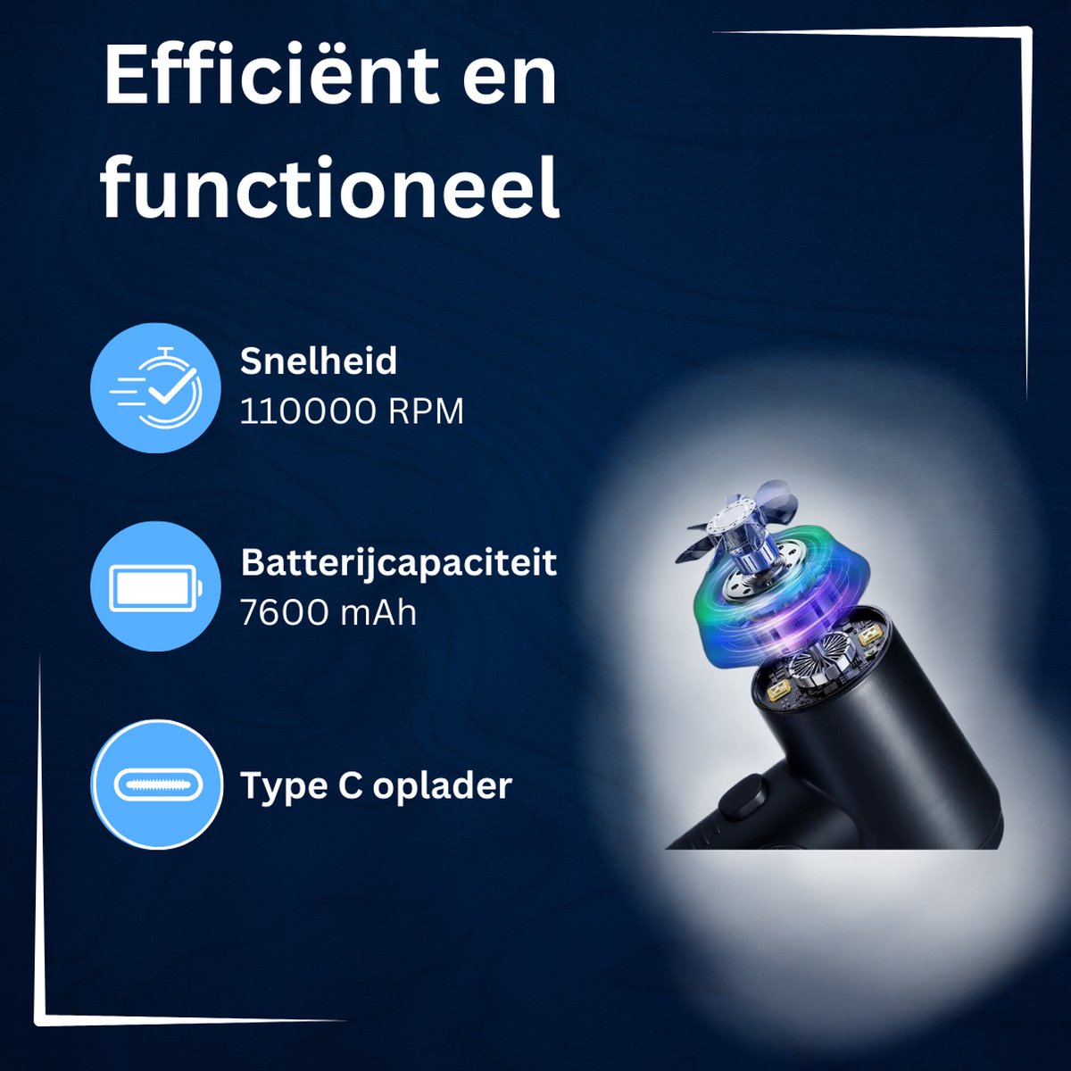 3. Batterijcapaciteit 7600 mAh: De krachtige batterij met 7600 mAh capaciteit zorgt voor langdurig gebruik zonder onderbreking, waardoor je meerdere apparaten in één sessie kunt reinigen.