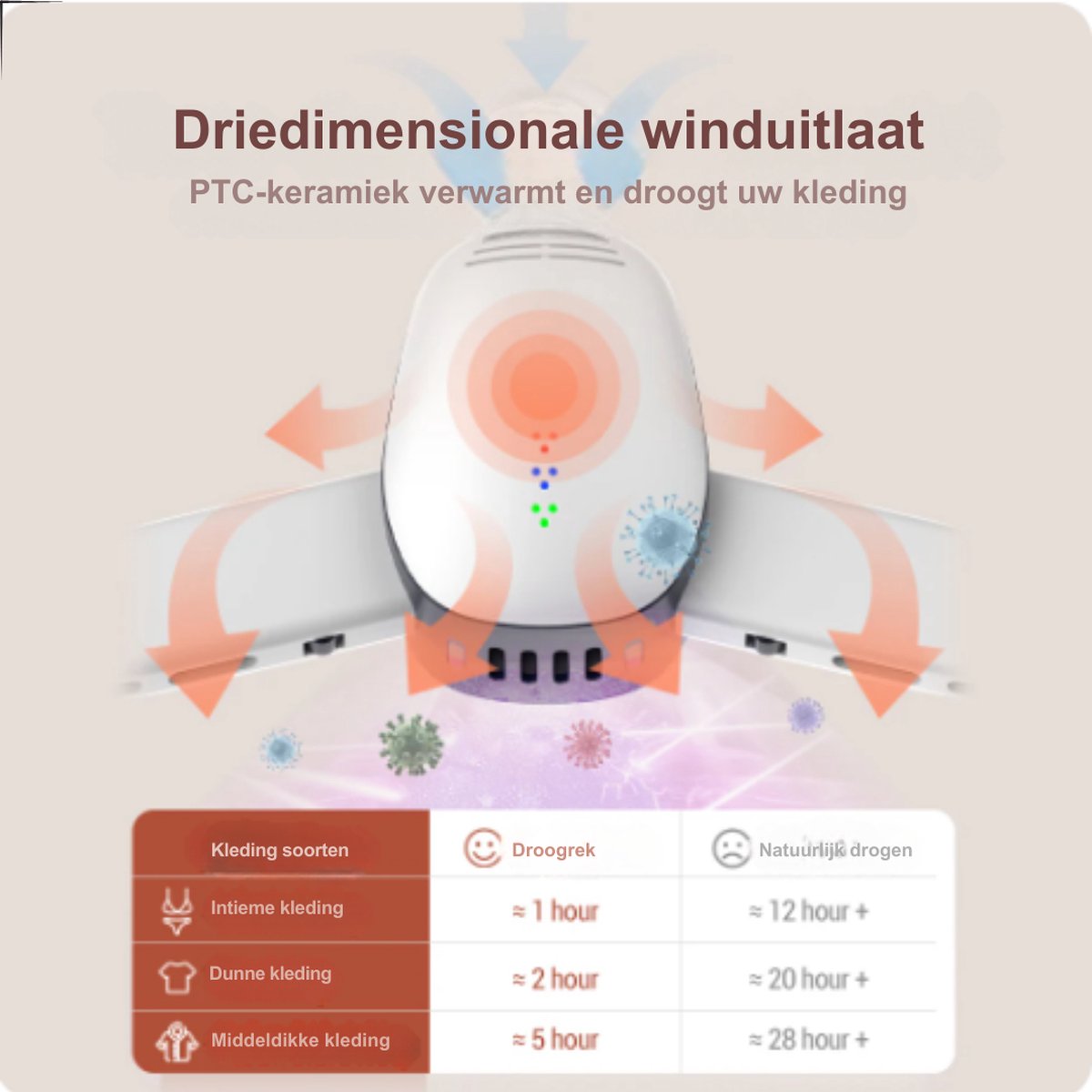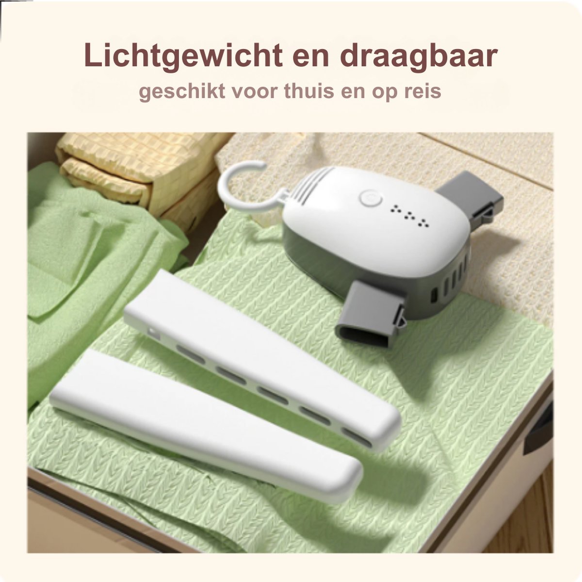 Lichtgewicht: Het lichte gewicht van de droger maakt het gemakkelijk om hem te verplaatsen en op te bergen. U kunt hem eenvoudig verplaatsen van de ene kamer naar de andere, of meenemen op vakantie of een weekendje weg.