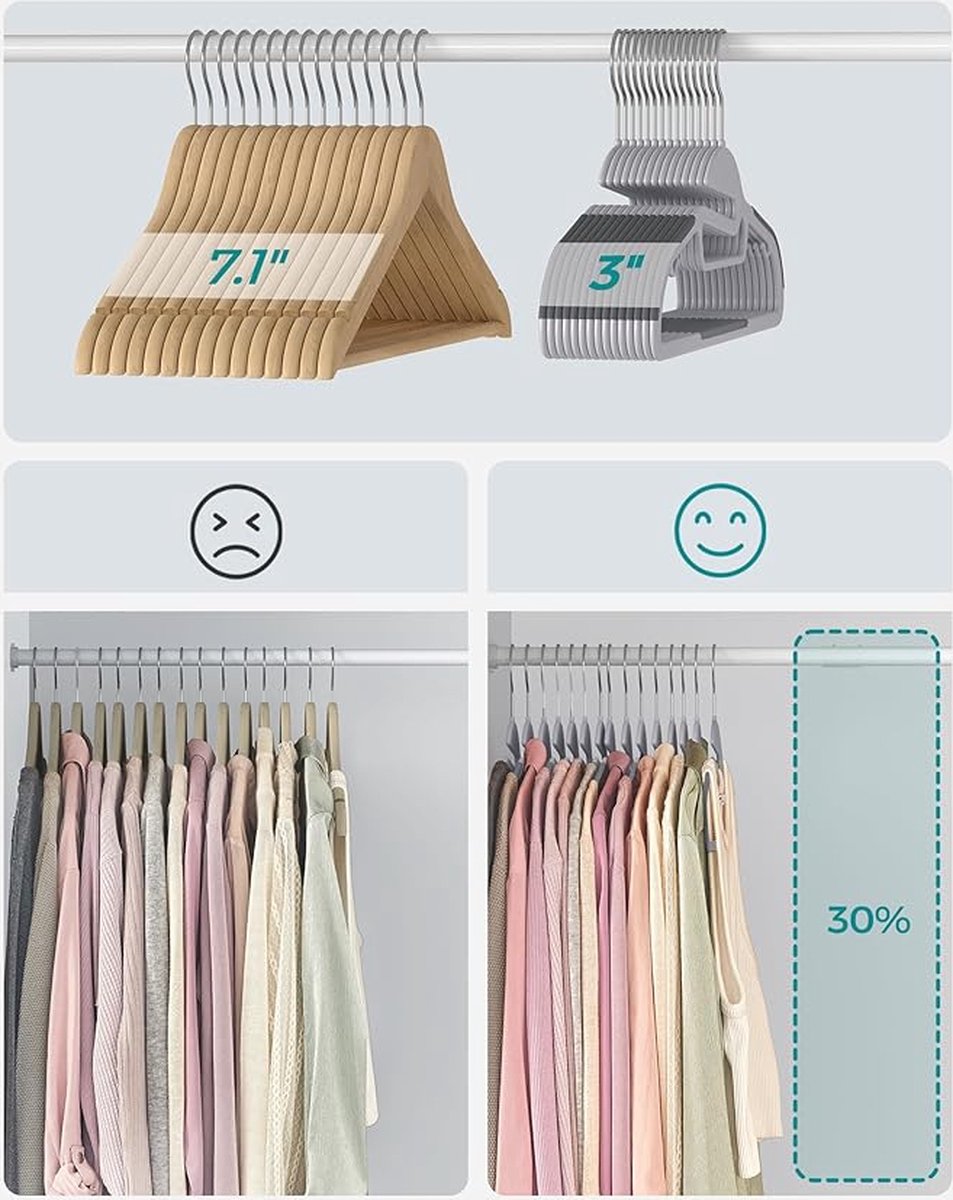 - [Geen lelijke vlekken] Deze hangers zijn gevormd om de rondingen van menselijke schouders na te bootsen, zodat ze uw kleding in perfecte staat houden en vervelende vlekken voorkomen