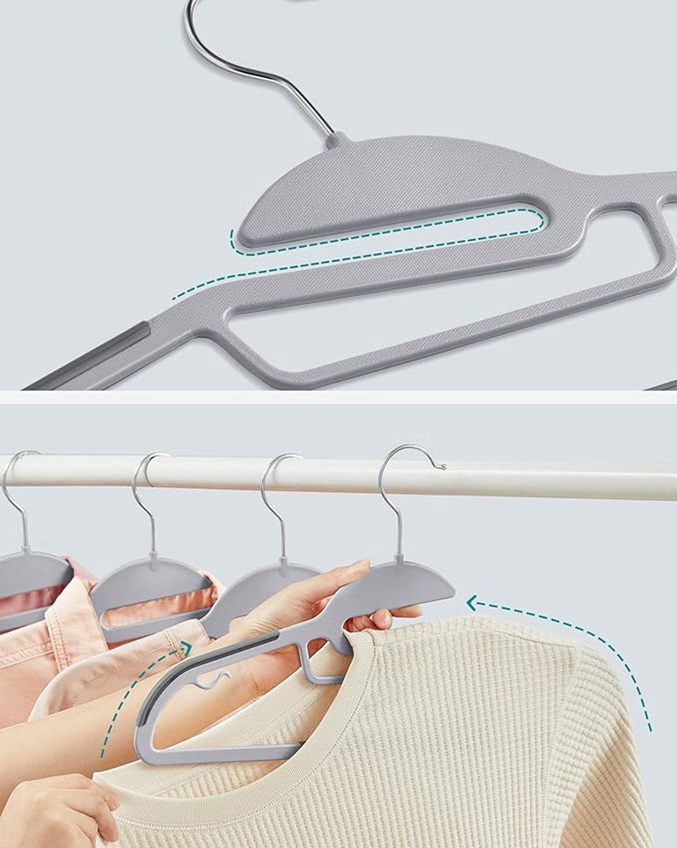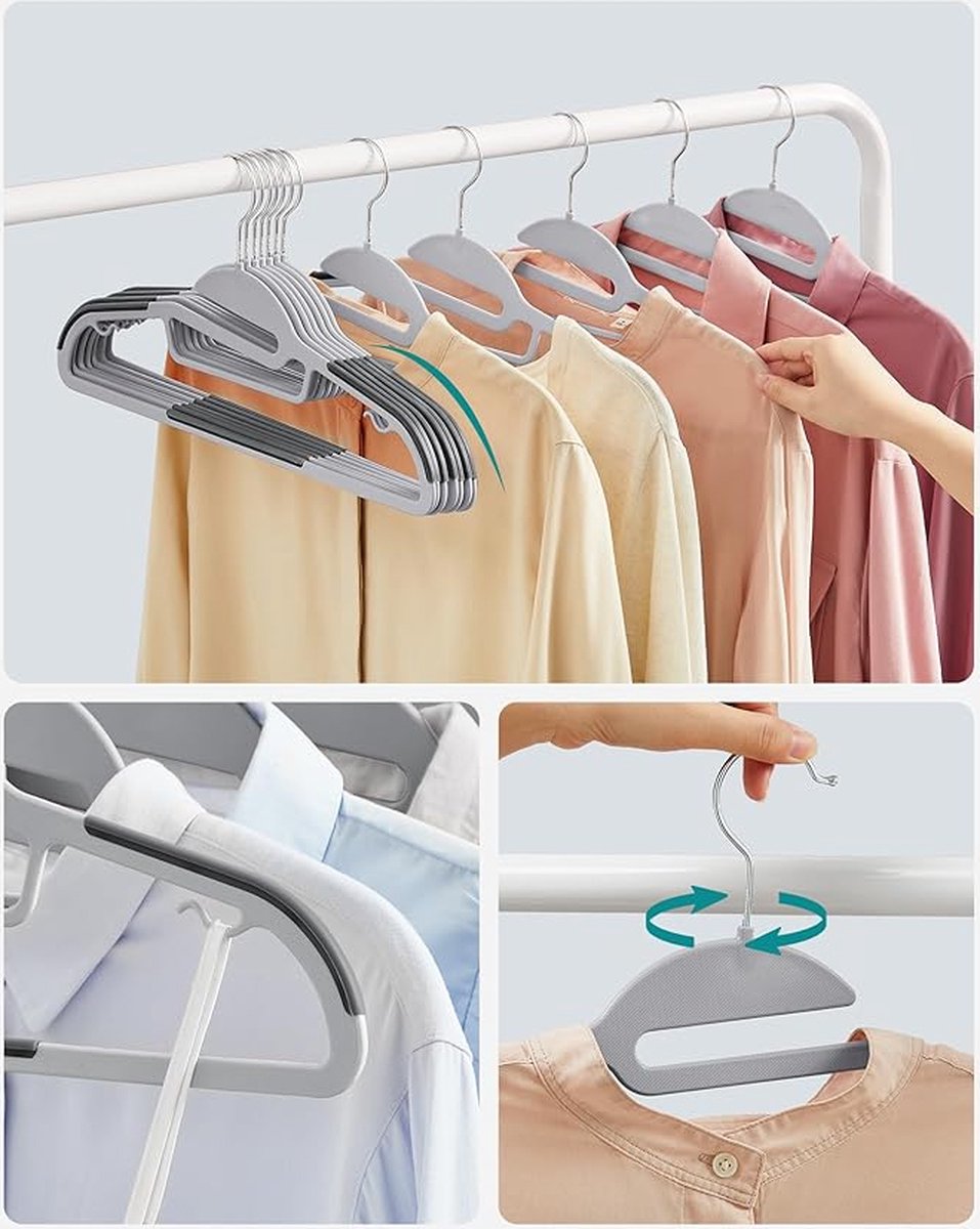- [360° draaibare haken] De hoogwaardige metalen haken van de 50 kunststof hangers draaien 360°, zodat u uw kleding gemakkelijk kunt ophangen en uittrekken