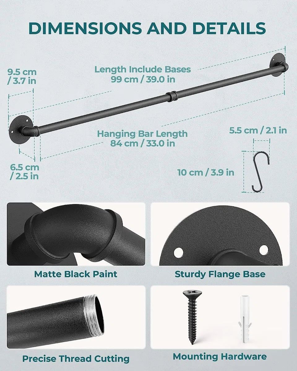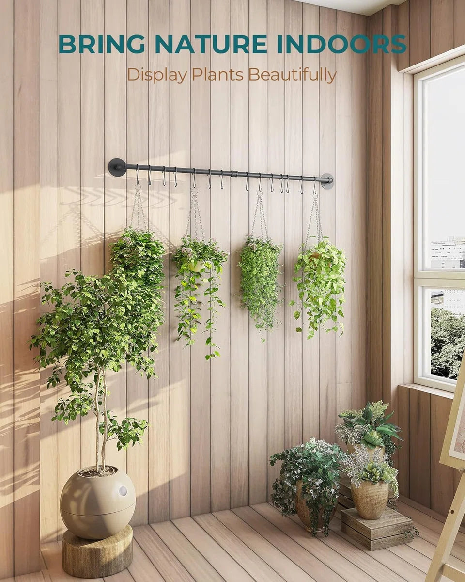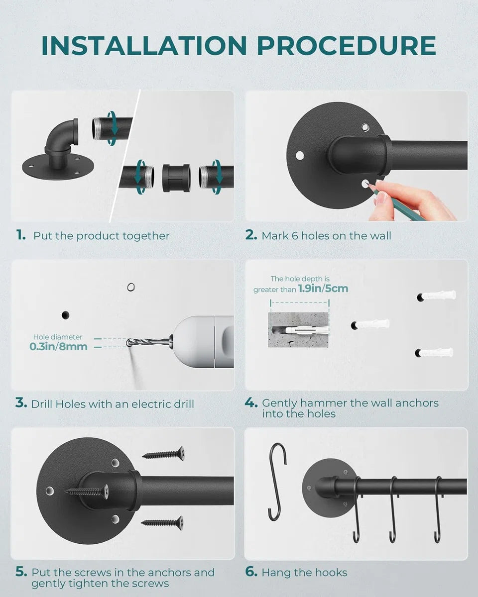 Duurzame en stevige metalen constructie: gemaakt van hoogwaardig ijzermateriaal met matzwarte poedercoating, niet gemakkelijk te buigen. Het oppervlak met verfcoating beschermt deze rail tegen corrosie en voorkomt roestophoping. Het heeft een sterk draagvermogen dat tot 35 kg kan dragen 14 verstelbare en verwijderbare haken: deze pannenorganizer met 14 S-haken biedt meer extra opbergruimte, perfect voor het ophangen van potten, pannen, handschoenen, kopjes en ander keukengerei Multifunctionele wandophangplank: De afmetingen van deze plank zijn 100 x 8,5 x 6,5 cm. En de afstand tot de muur is 3,5 cm. Hij kan niet alleen als servieshouder in de keuken worden gebruikt, maar ook als deurleuning, handdoekenrek, bekerhouder, plantenhanger bij de ingang, badkamer, balkon, enz.