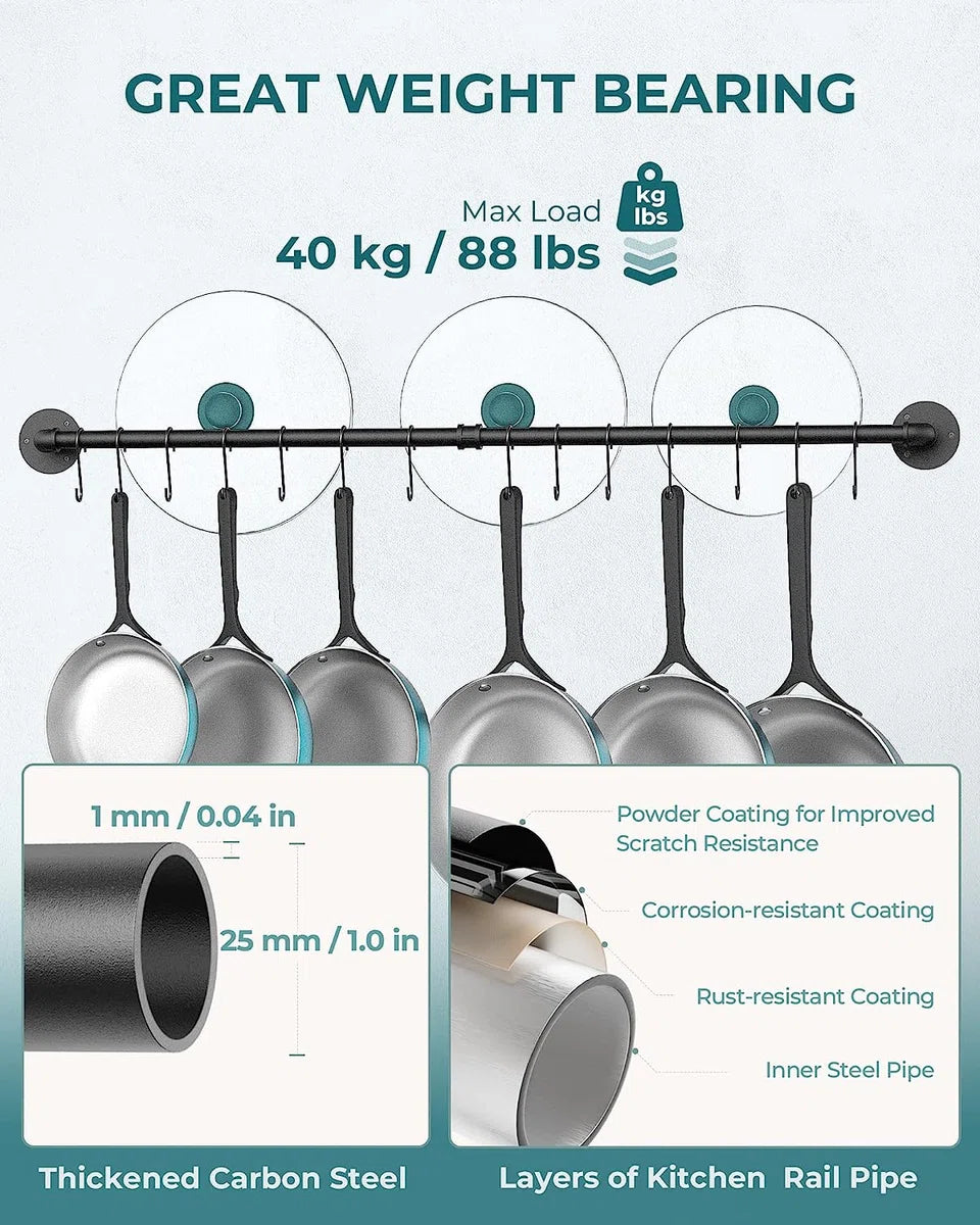Pannenrek, keukenrek, pannenhouder, keukenstang met haken, 100 cm lang